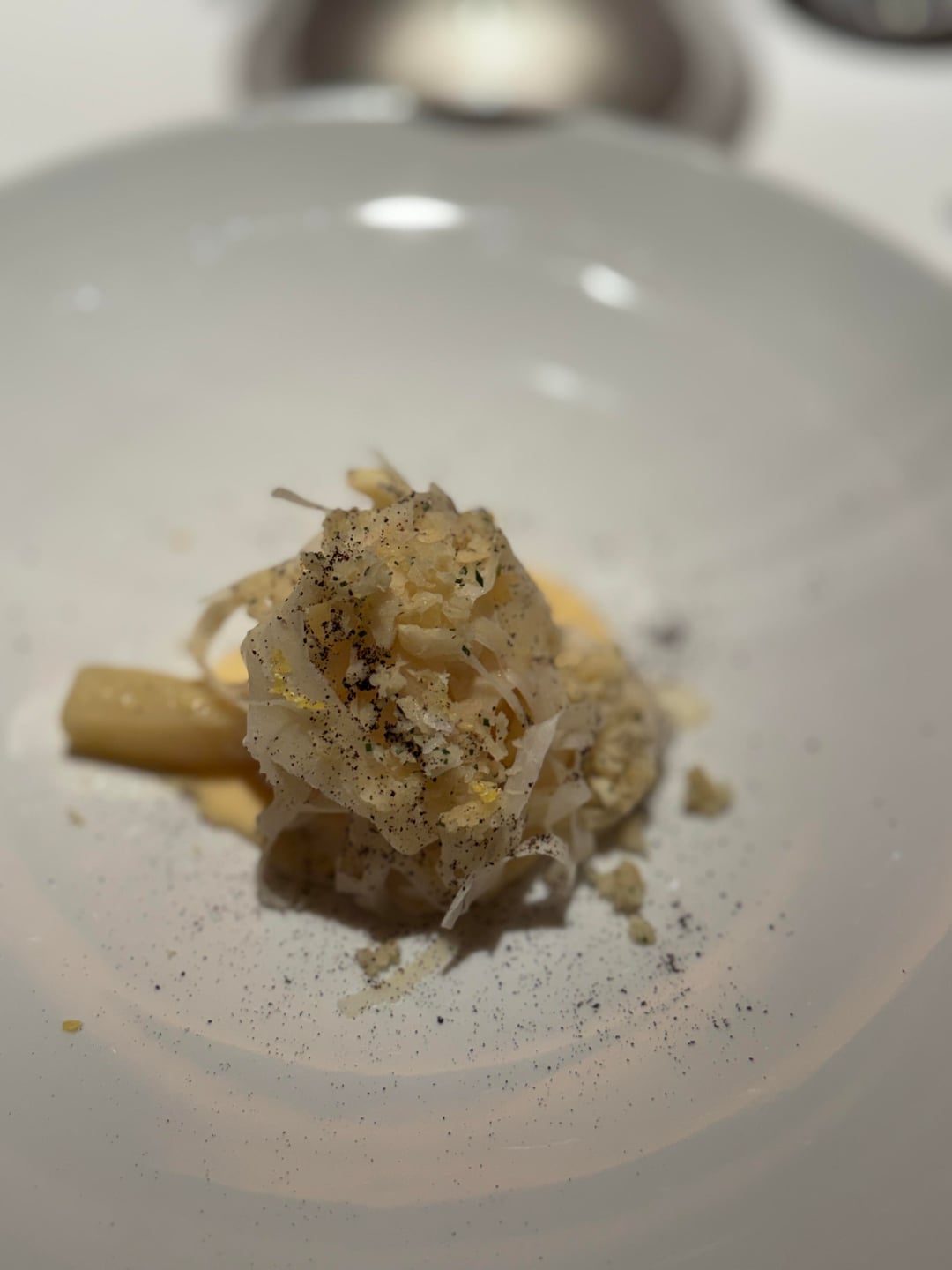 They used only the white of the leek, burnt it and then roasted it in a vacuum. The scentless chamomile is a local product that doesn’t have the typical flavor you would expect. It has a bit bitterness but also herbal freshness.White Cabbage Core | Parsley Root | Black Salsify | Fermented Lemon