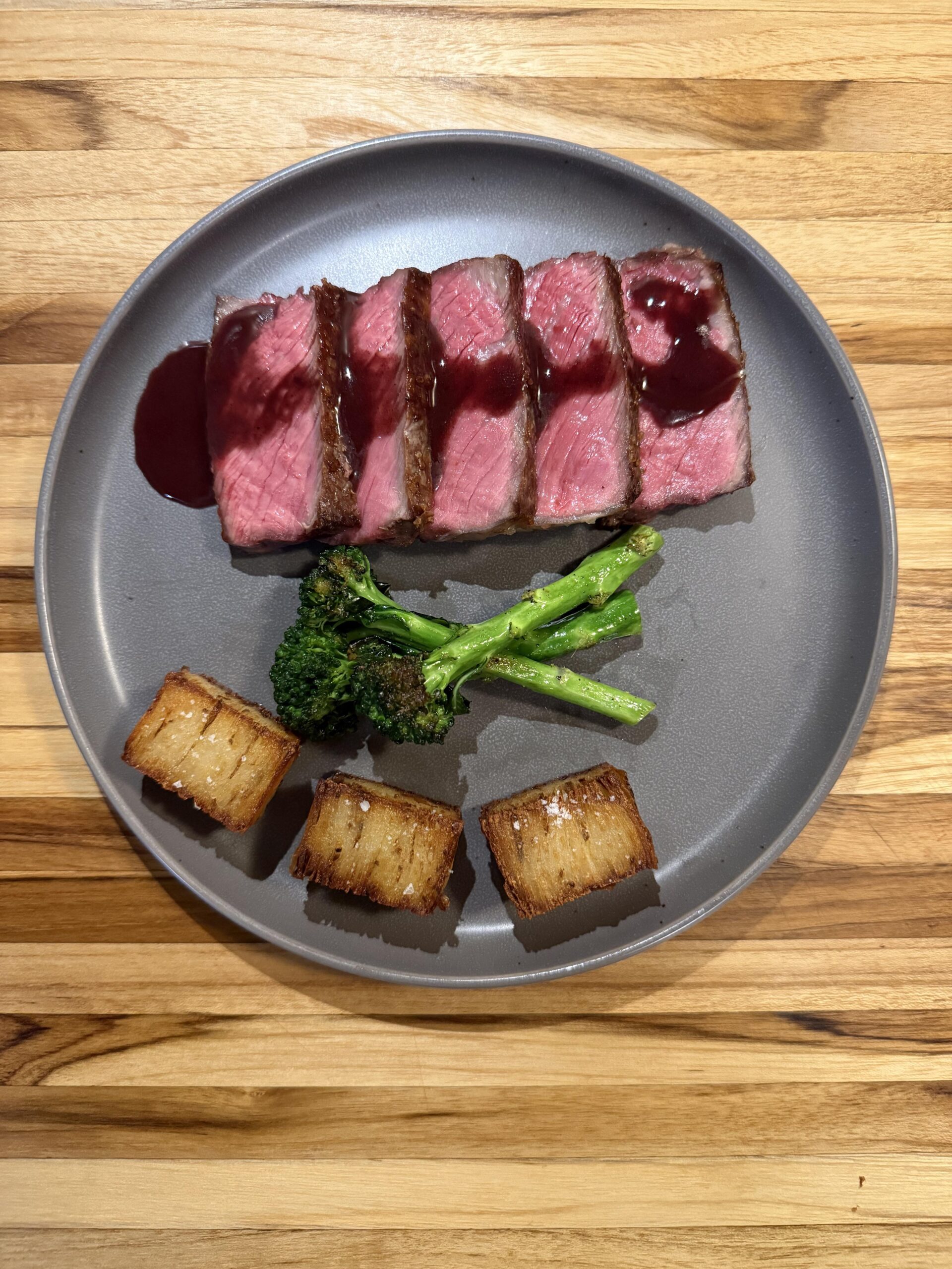 Steak looks good. Plating – you arranged everything as a square, while having a round plate. Bring everything right together. Put broccolini under the steak even to give height. Instead of 5 cuts, do 3 thicker ones. Pave, do one long one or two larger. Sauce, 2-3x as much. Only put it under the meat. You can add oil to gloss it up if you want, sprinkle flake salt on it. Not the steak of sauce. Wine sauce goes under the meat. Not over it. If something goes over it then it should cover 1/2 of the meat.