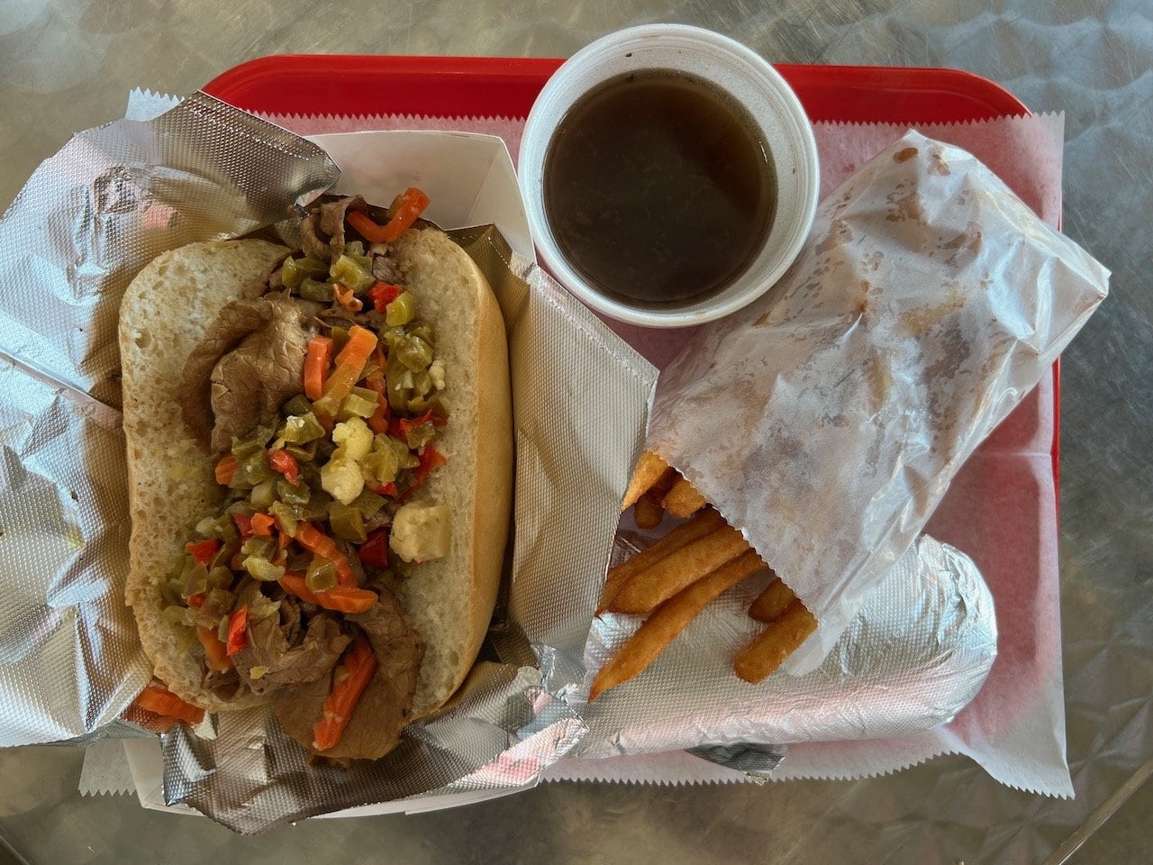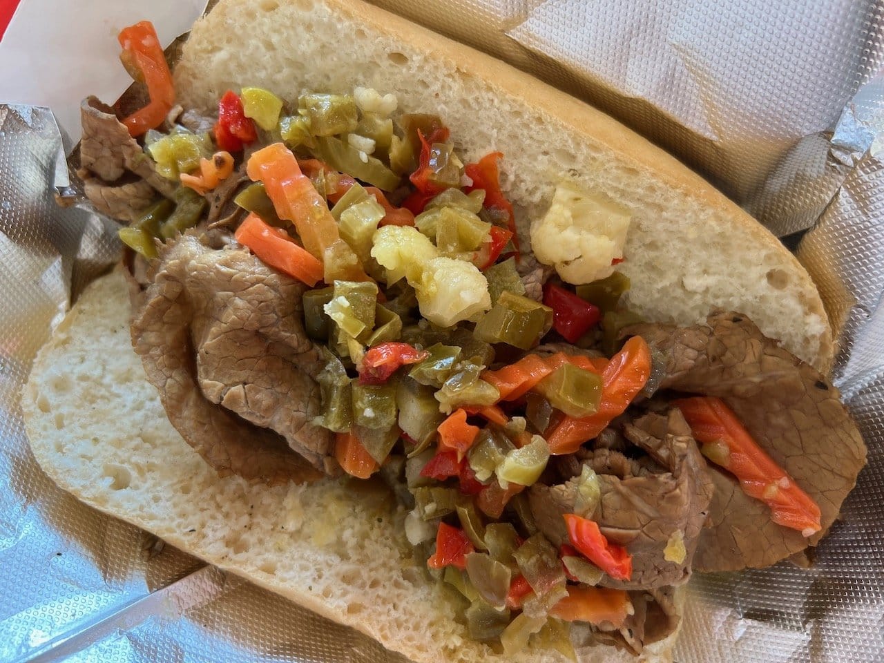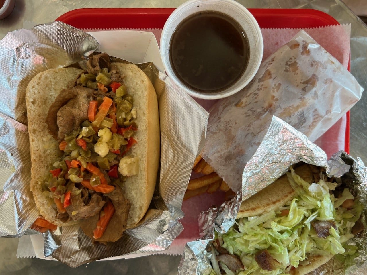 Since we were craving the sandwich after watching The Bear, we ordered that first-off. The classic Chicago Italian beef sandwich features sliced roast beef cooked in au jus, served on a French roll with giardiniera. Loops’ version is available dipped (soaked in au jus), dry, or with the jus on the side.