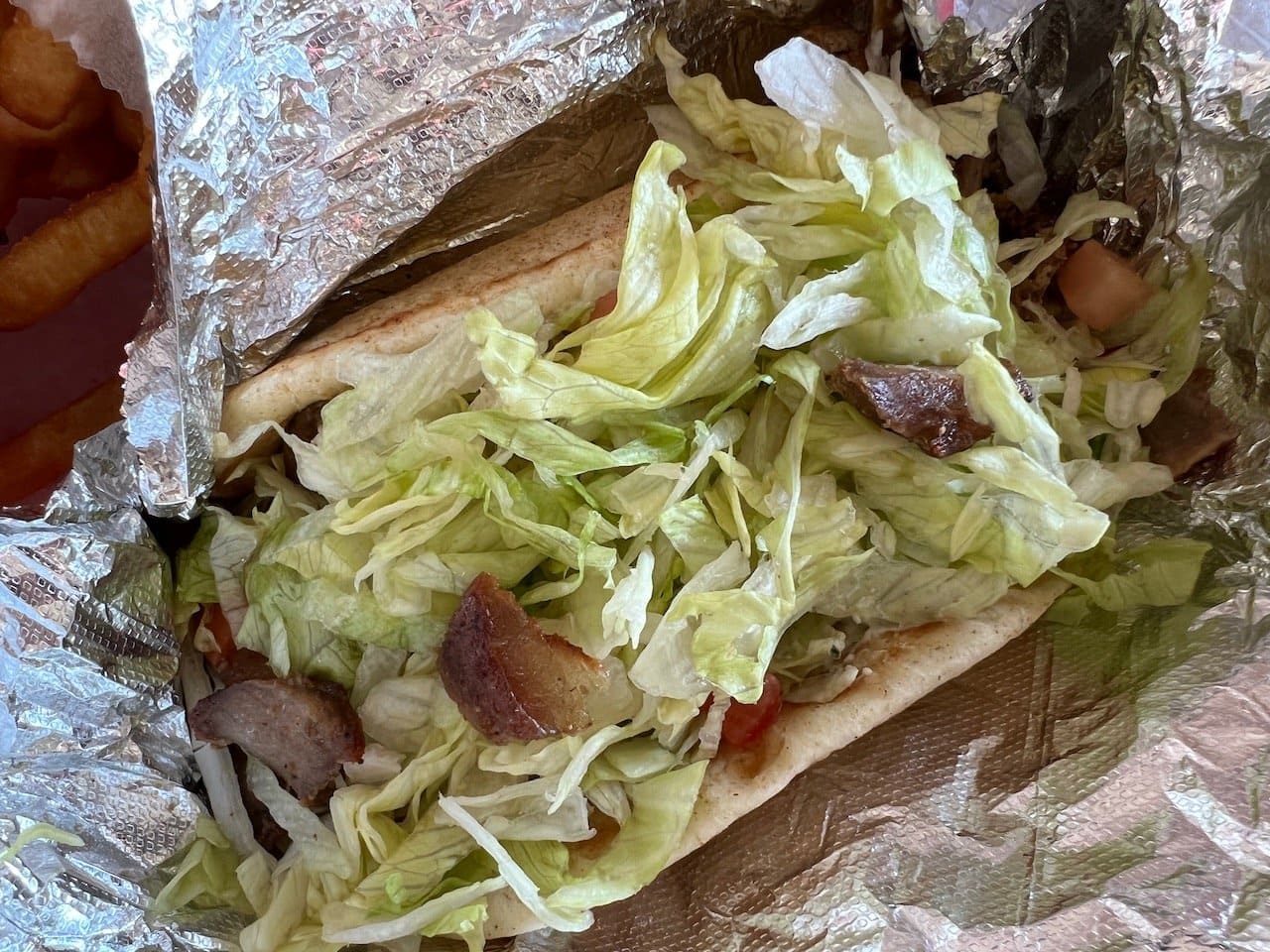 It’s not often you find gyros made with beef, and we liked the option. It’s overflowing with shredded lettuce, onions, diced tomatoes.