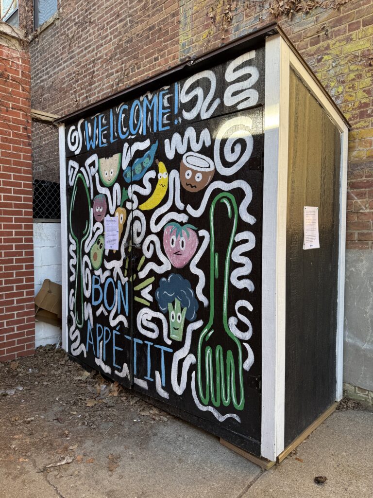 A community fridge operated by Saving Grace Perishable Food Rescue sits near 40th and Hamilton streets in Omaha, Nebraska, offering free access to fresh food for anyone who needs it. (Mikala Harden)
