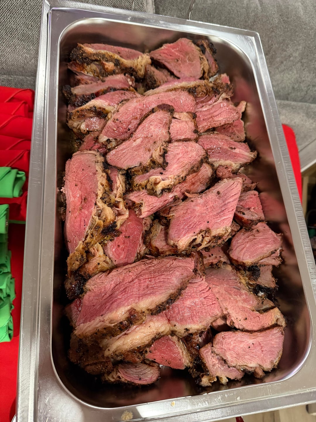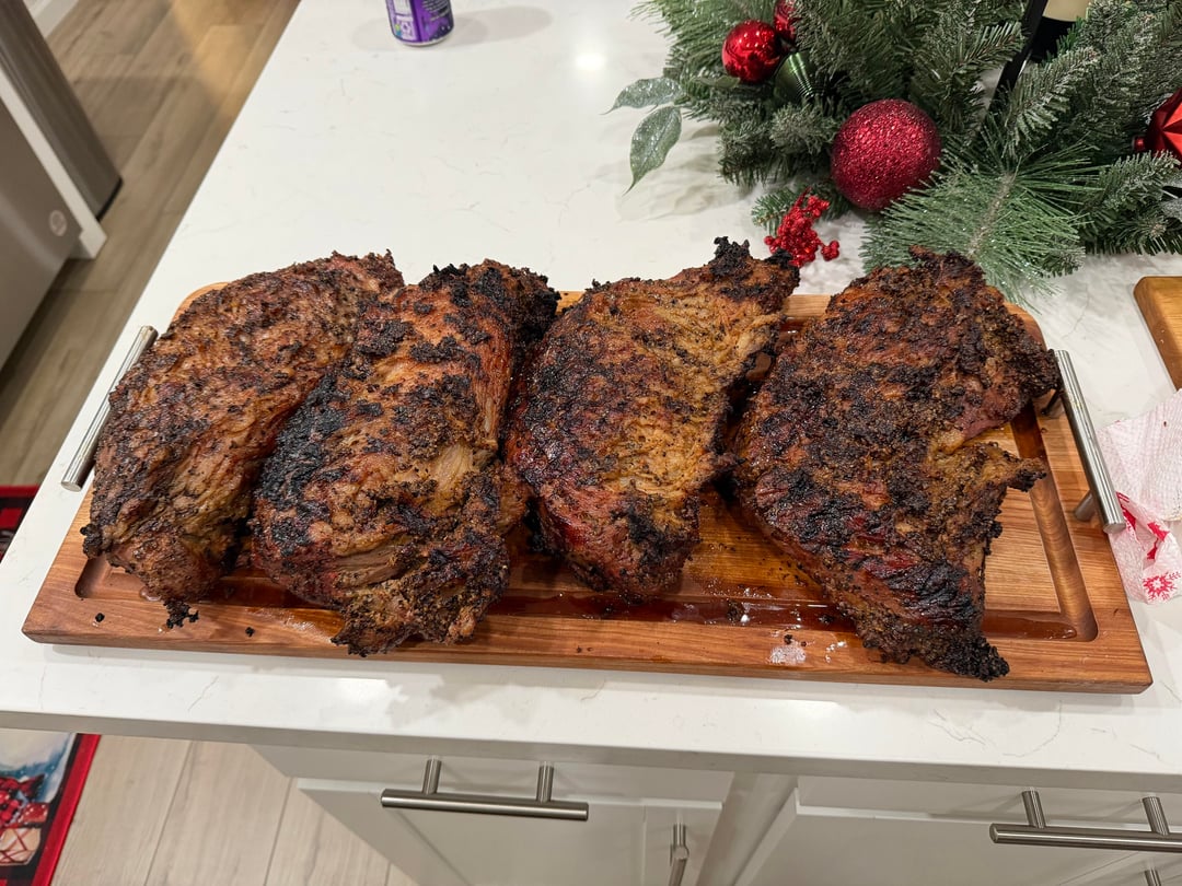 Wife and I hosted a group of friends for a holiday party so I smoked four 4lbs tri tips. Smoked them on my GMG at 225° for about an hour and 50 minutes, pulled them off and seared them on my grill at about 650°. Rested and sliced, came out AMAZING