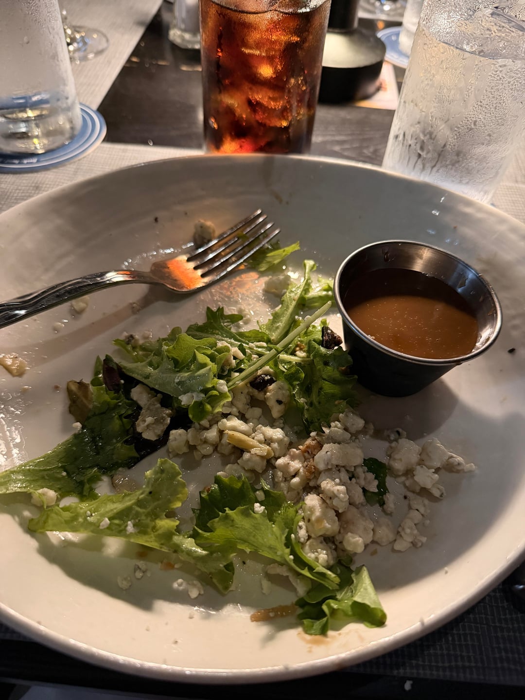the description of this is a flame-grilled ny strip, power greens, toasted farro, heirloom tomato, haricots verts, fire-roasted artichokes, maytag blue cheese, balsamic vinaigrette. i don’t believe there was any farro, i took off most of the fried onion on top, and i didn’t use any of the dressing. the second slide shows what i left