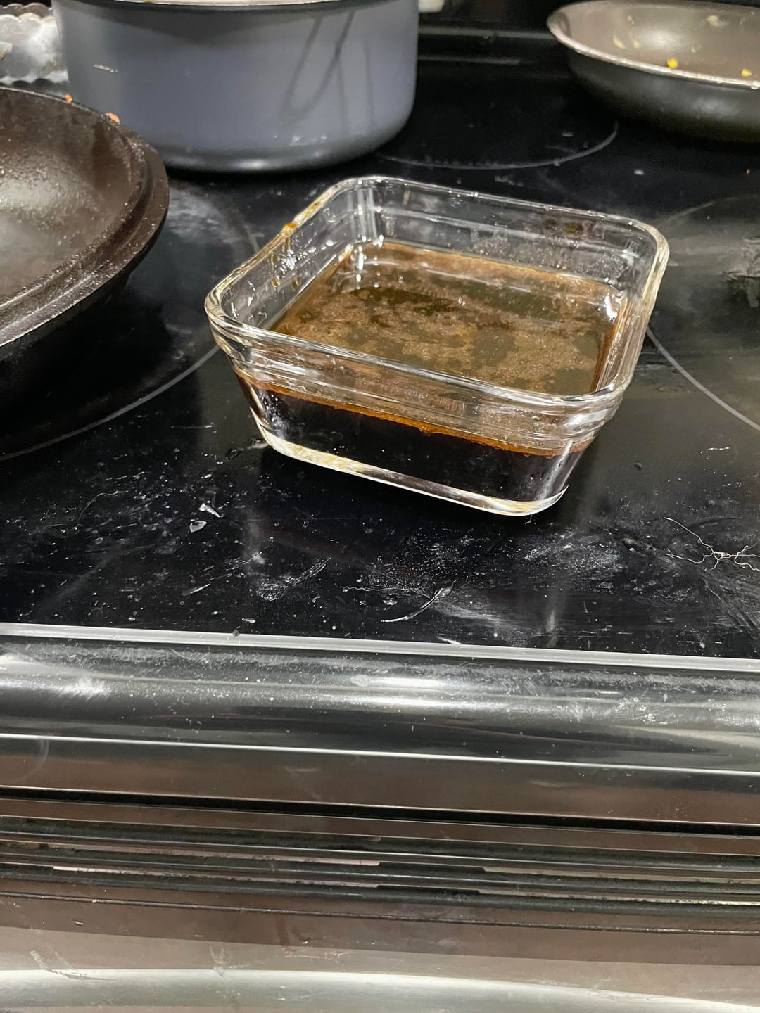 For the Au jus I placed a 10 inch cast iron skillet (with a little water and minced garlic) on my Conveggtor, under the prime rib, to collect the drippings. About halfway through I added some more water with a little bit of Dales marinade mixed in (but seriously not much at all. I wanted to let the drippings make the flavor) to keep it from drying out.