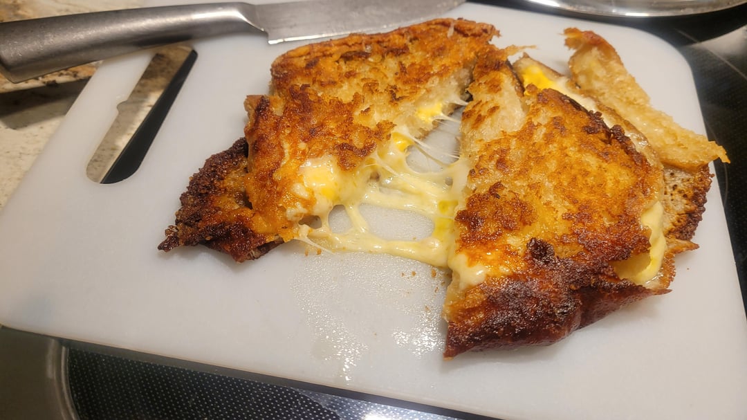 Getting to the end of that loaf of homemade sour dough! English cheddar, mozzarella for the stretch, amd Ole reliable American for extra melty goodness.
