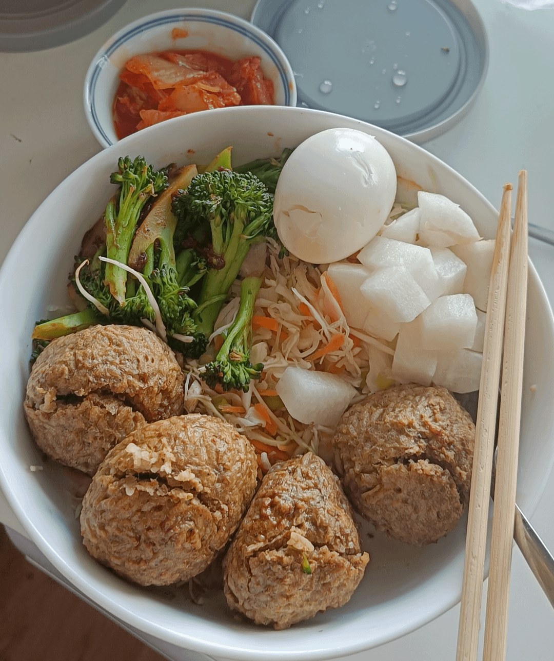 Topped with homemade tofu/rice balls (chili, mushroom, Szechuan)(recipe in photos), soft boiled egg, steamed broccoli tossed with samjang and black pepper, and pickled radish. Soya drizzled over the balls. Served with kimchi.