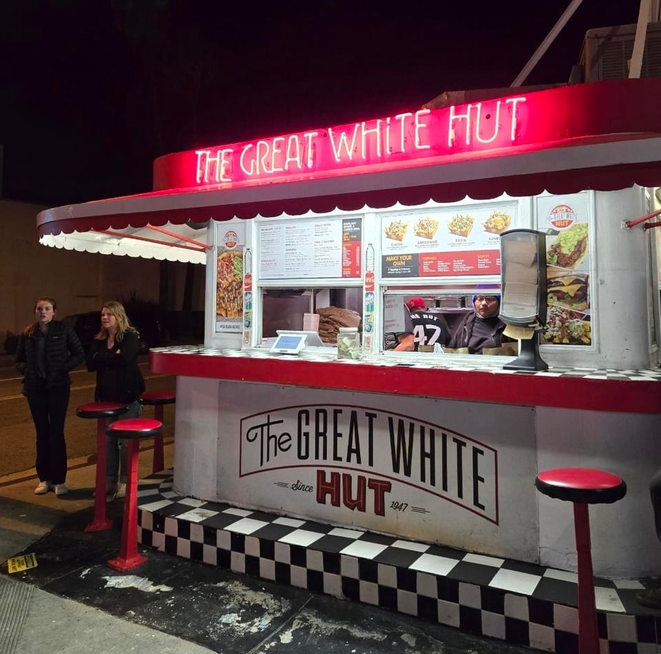 Little roadside shack in Glendale, burgers are really good, nothing fancy but if you're craving a "shackburger" this really hits. I like that they toast the buns, I know it looks a bit dark but it really added something texturally. This place is also known for like, loaded fries i guess. When you go to their website the first thing they mention is something like "it started with a few friends who had a dream to sell European style French fries, so they bought the Great White Hut." No info on the history of the place before the french fry revolution or anything, which is odd. The fries are fine but I think they should focus on burgers, though they also have pretty decent burritos.