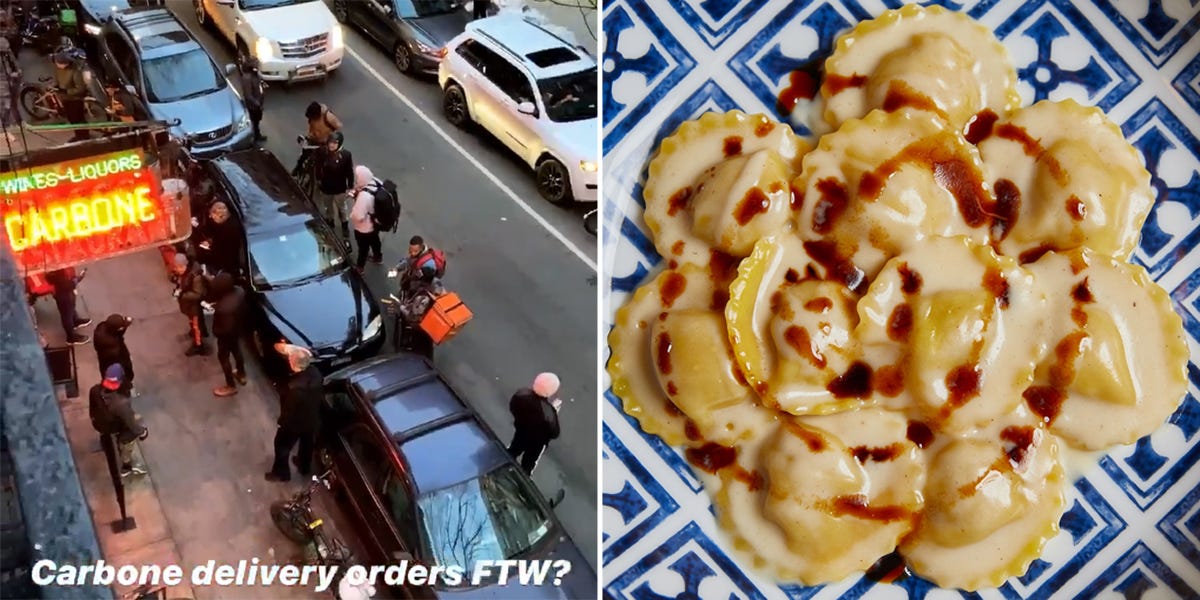 A crowd gathered in front of Carbone to pick up delivery and takeout orders.