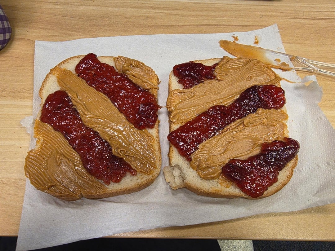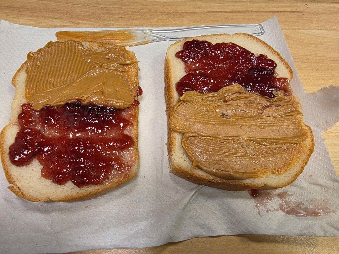 I’m a big fan of doing peanut butter and both slices and then jelly on one, to prevent soggy bread. It doesn’t need to be double peanut butter, just on both slices