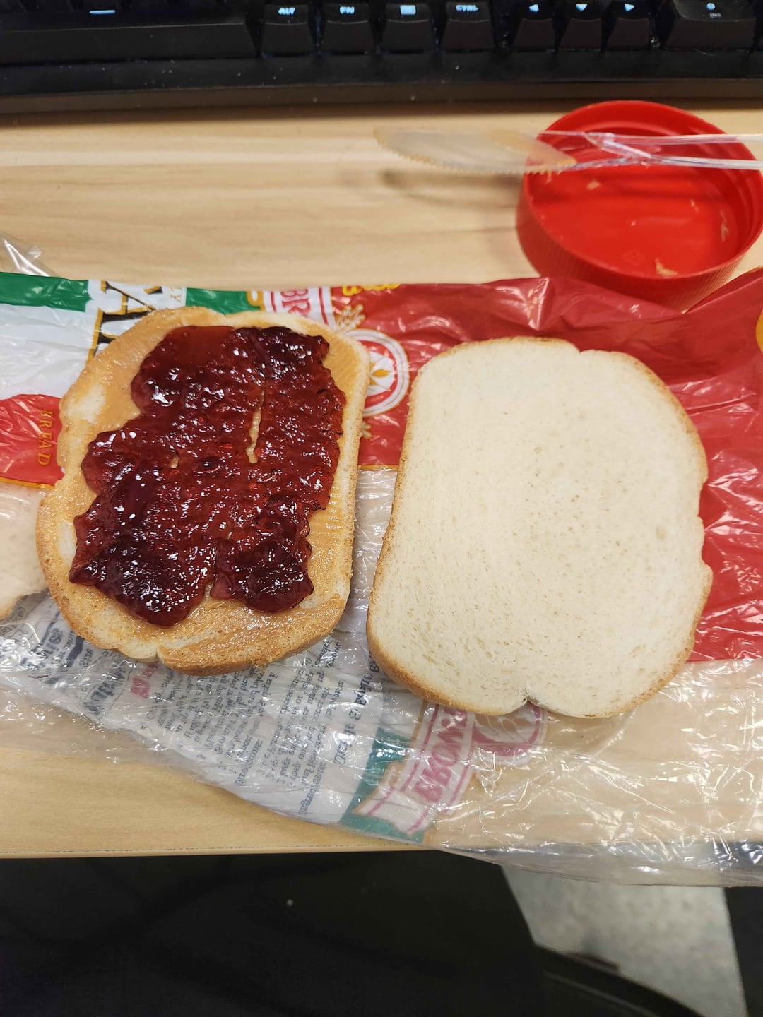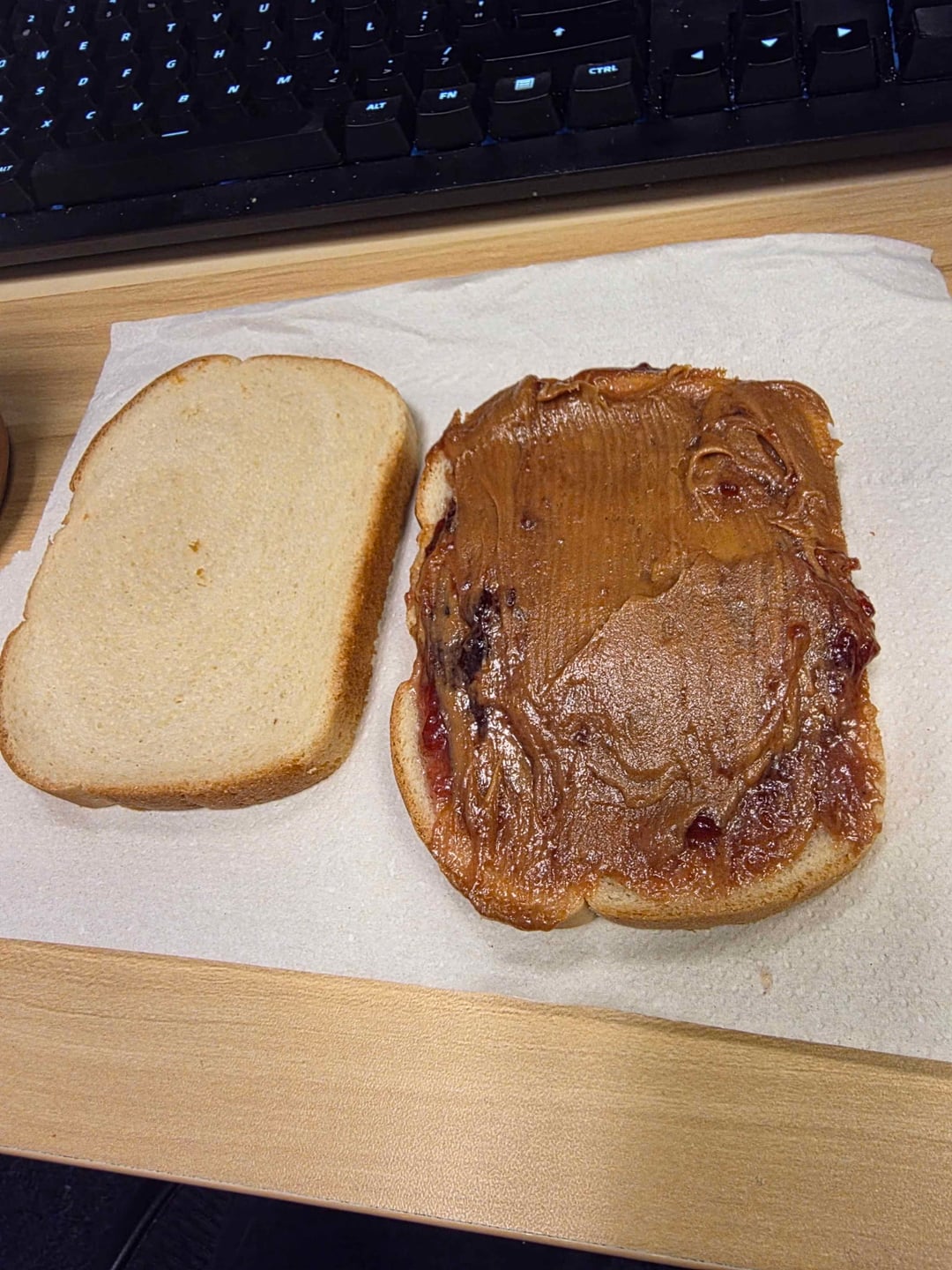Stir the PB with the J together in a 1:1 ratio until it’s homogeneous before putting it on the bread. None of that Goober pre mixed shit, you gotta buy them separate then stir them together. Trust me on this one, it’s how I grew up eating them and I wouldn’t have it any other way.