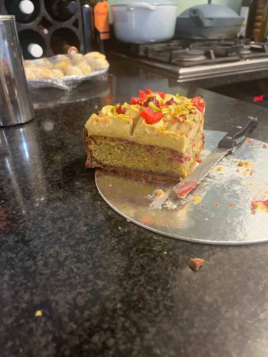 What do you guys think for this entire half of pistachio Bakewell tart? The topping was a bit like cream cheese, not very sweet. Second image shows it cut in half. Thanks:)