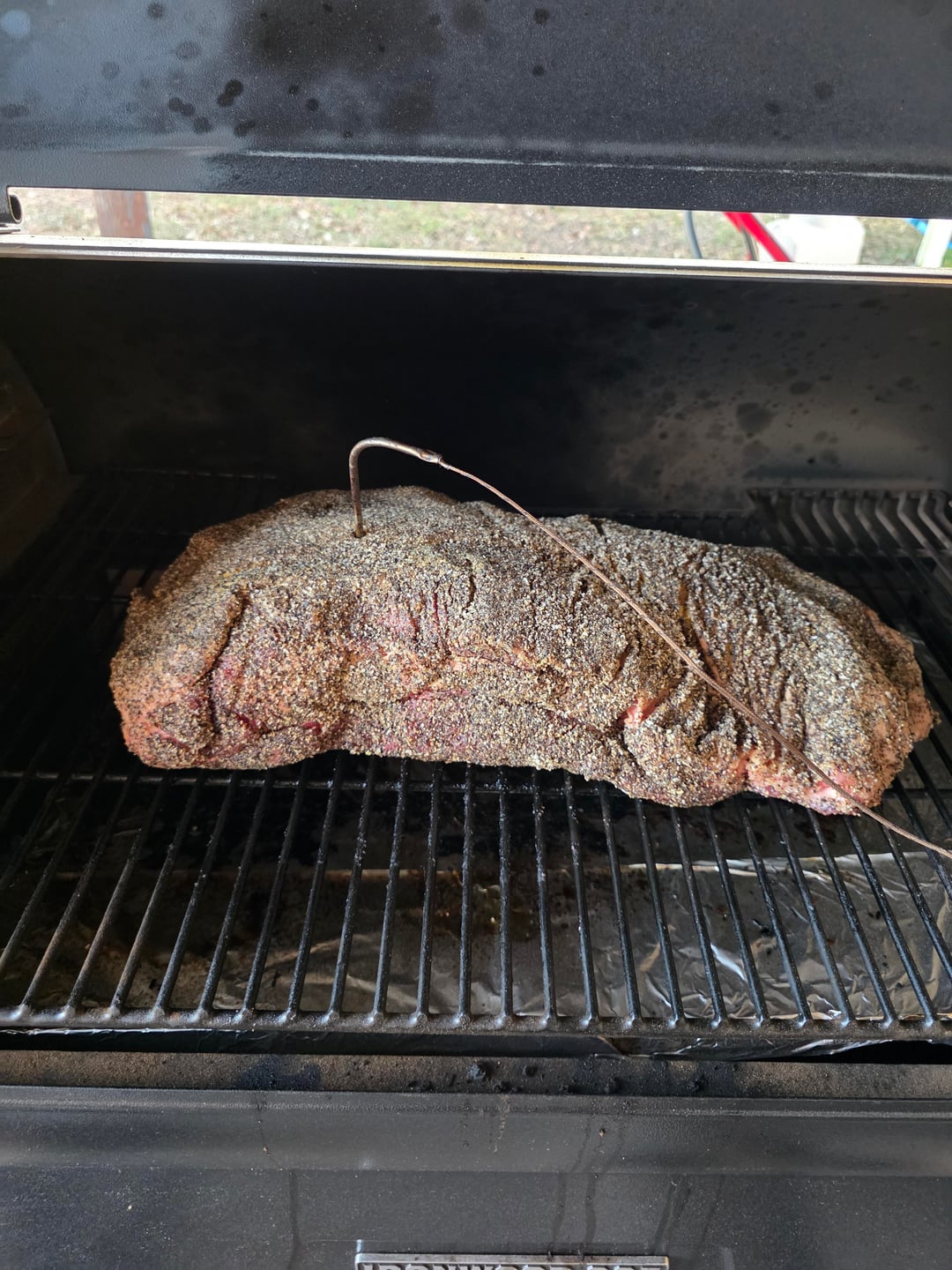 How am I doing? 12 hours later, is my brisket looking good? 200⁰ since 5pm last night. Now 5am, probe is reading 159⁰. This is a big hunkin 18lb brisket. Figured due to its size it might take a bit longer to finish. How's my bark looking after 12 hours? Should I increase the temp?