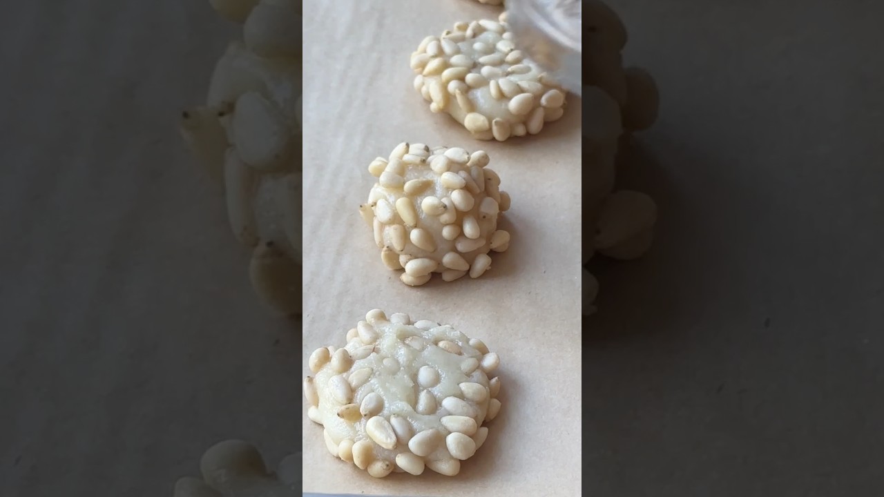 With wet hands, roll the dough into small balls. Gently roll each ball in the pine nuts to coat completely and place on the prepared baking sheet.