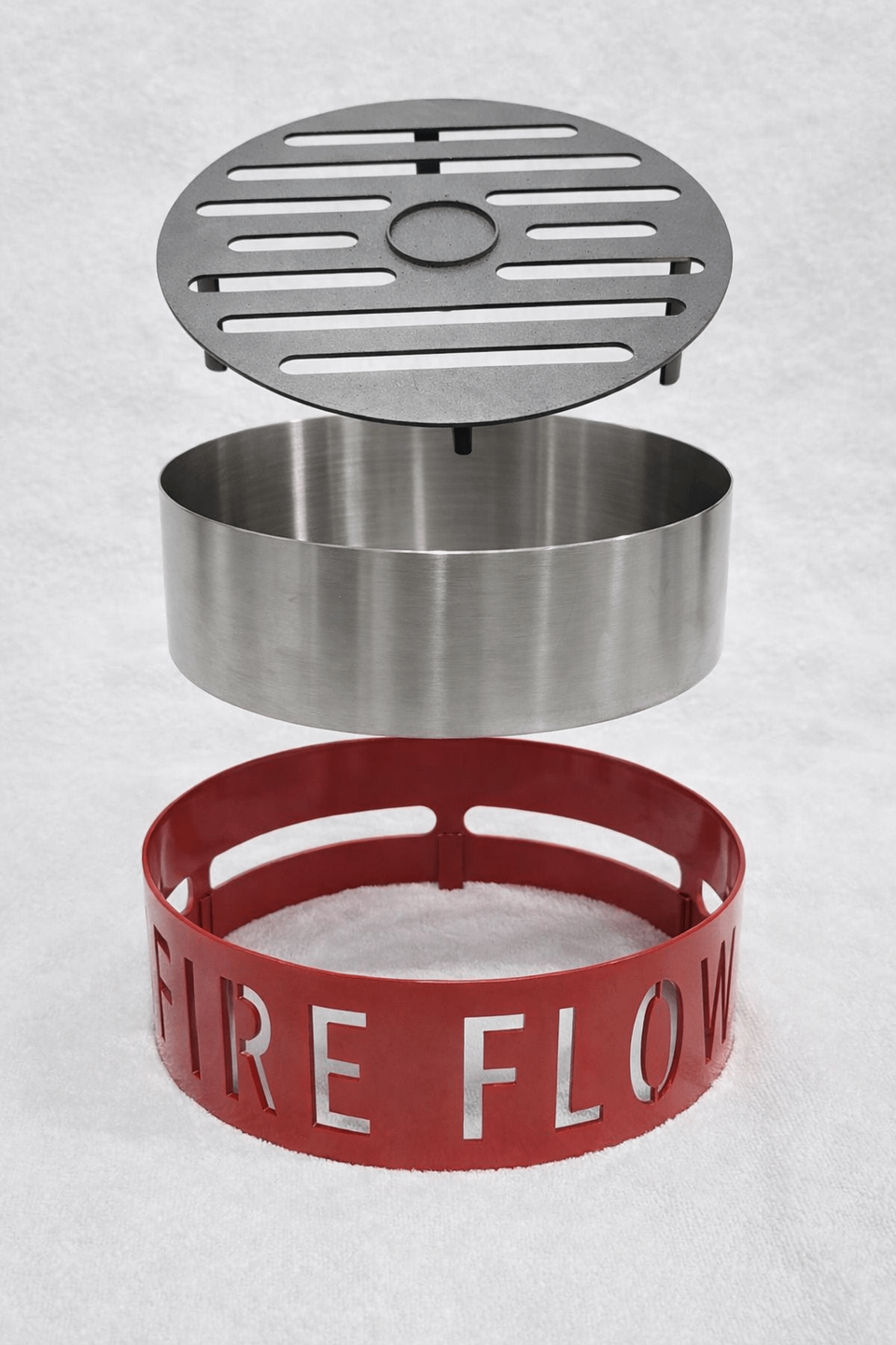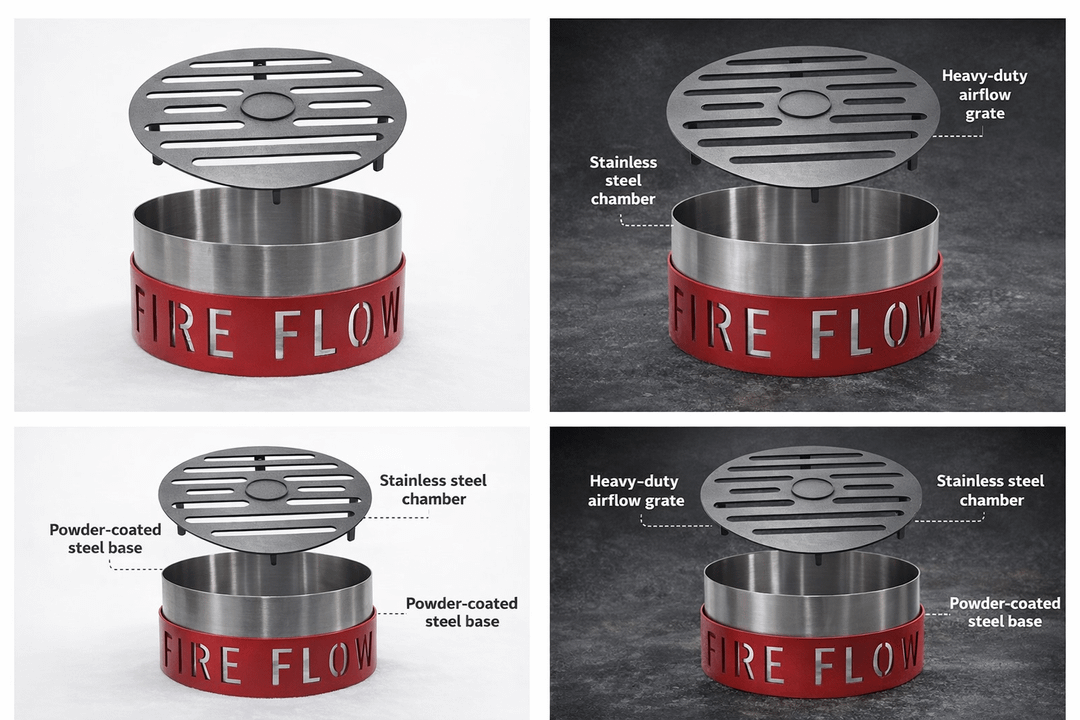 So I built this small modular base that sits under any standard chimney. It channels air upward, keeps the flame centered, and gets the coals going faster without lighter fluid. It’s just a simple 3‑piece setup: a heavy‑duty airflow grate, a stainless steel chamber, and a powder‑coated base.