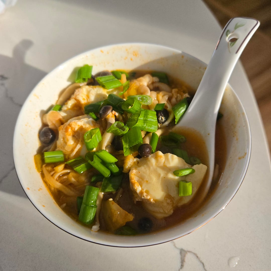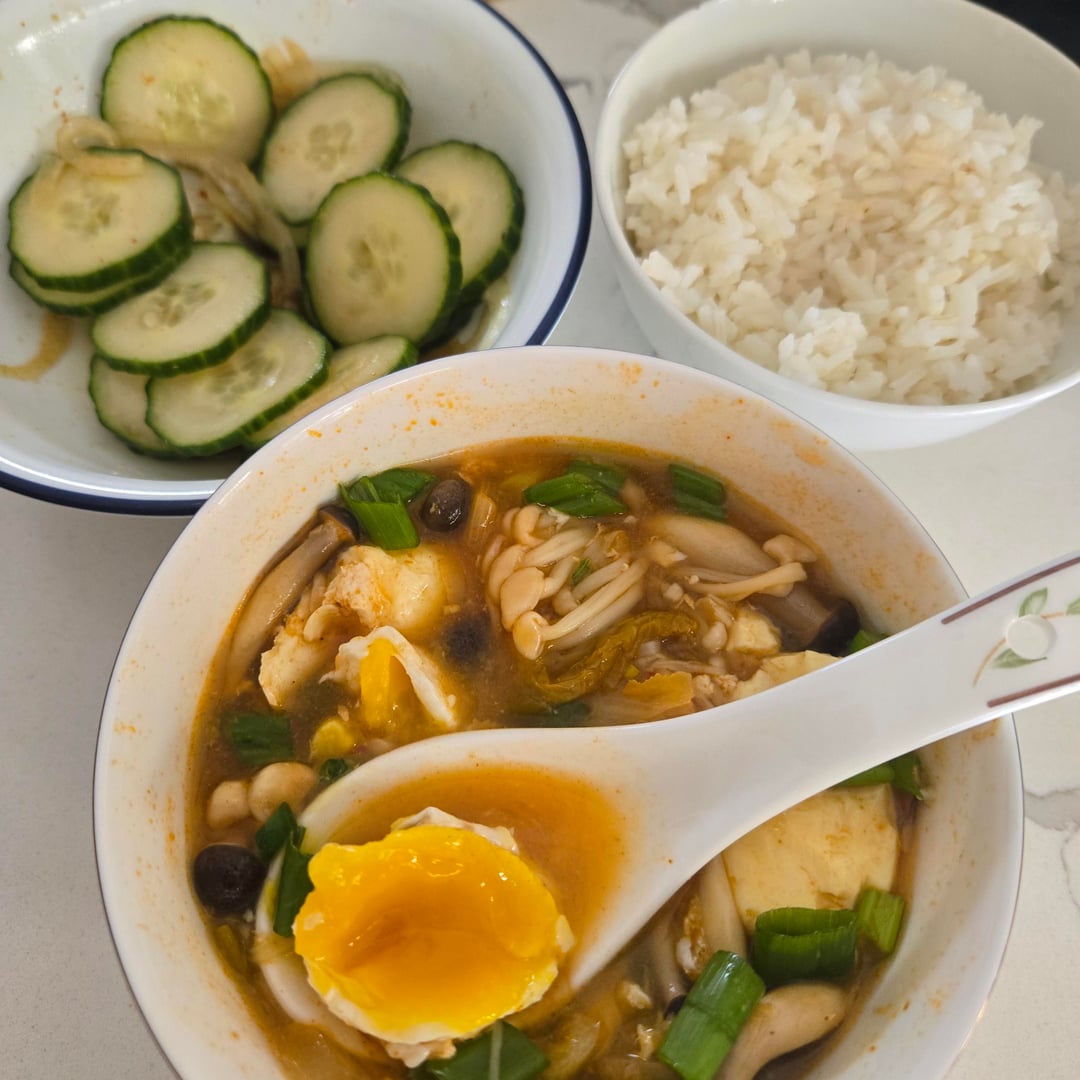 Once boiling, I added some rinsed mushrooms (I did enoki and shimeji), half a container of korean soft tofu (it's the kind that comes in a cylinder instead of a block, but silken tofu would work too), no need to chop it, just break it up gently in the pot. I cracked one egg into the pot. it's done by the time the egg is cooked! top with the remaining scallions.