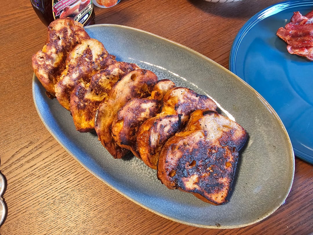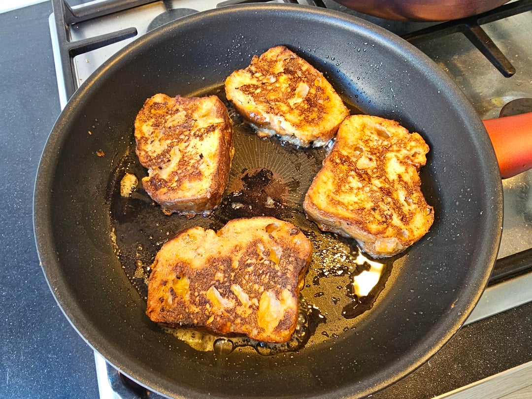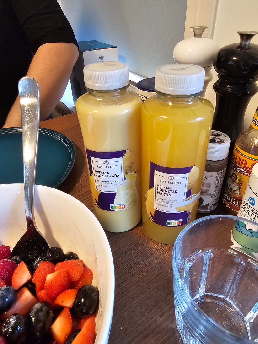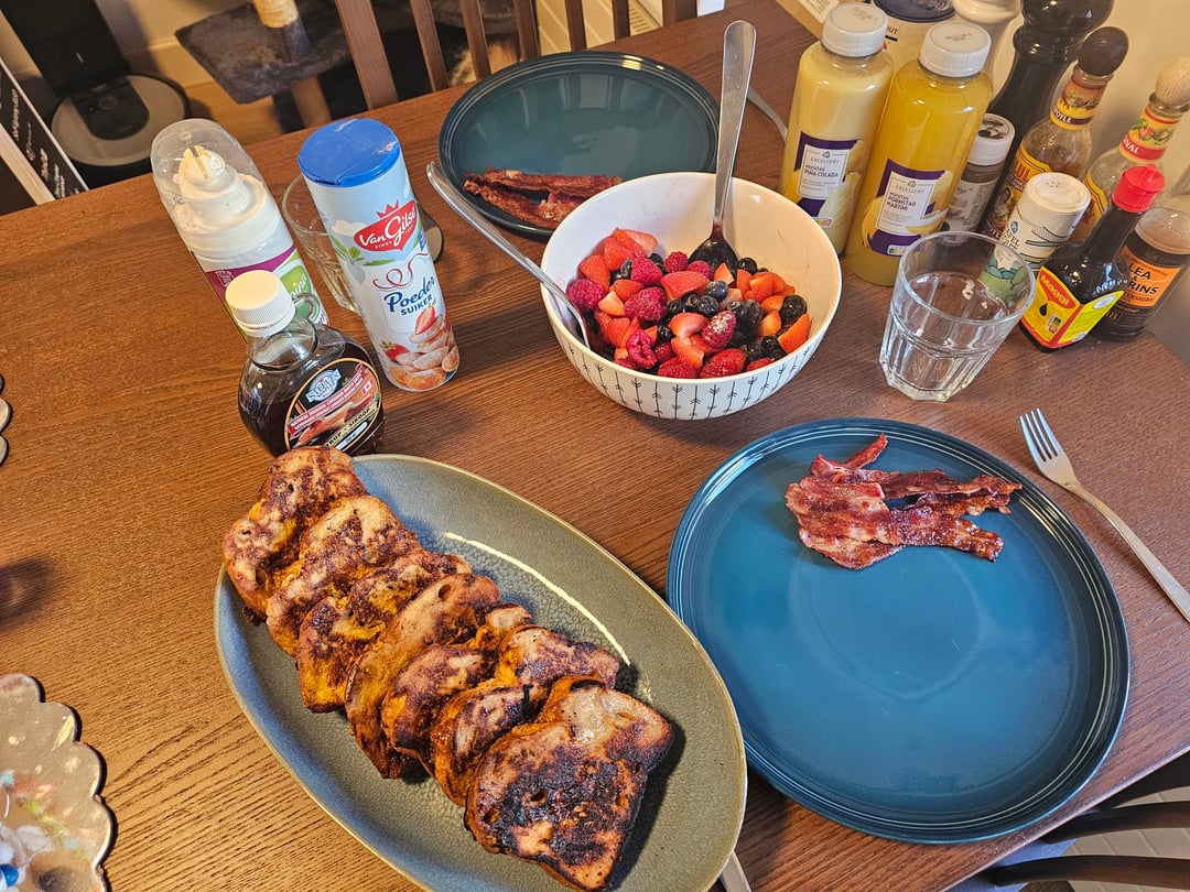 I made french toast out of suikerbrood (translation: sugar bread). It's like a croissant and a sugar cube had a baby. I cooked it in bacon fat and served it with berries, whipped cream and maple syrup. We had some mocktails and coffee.