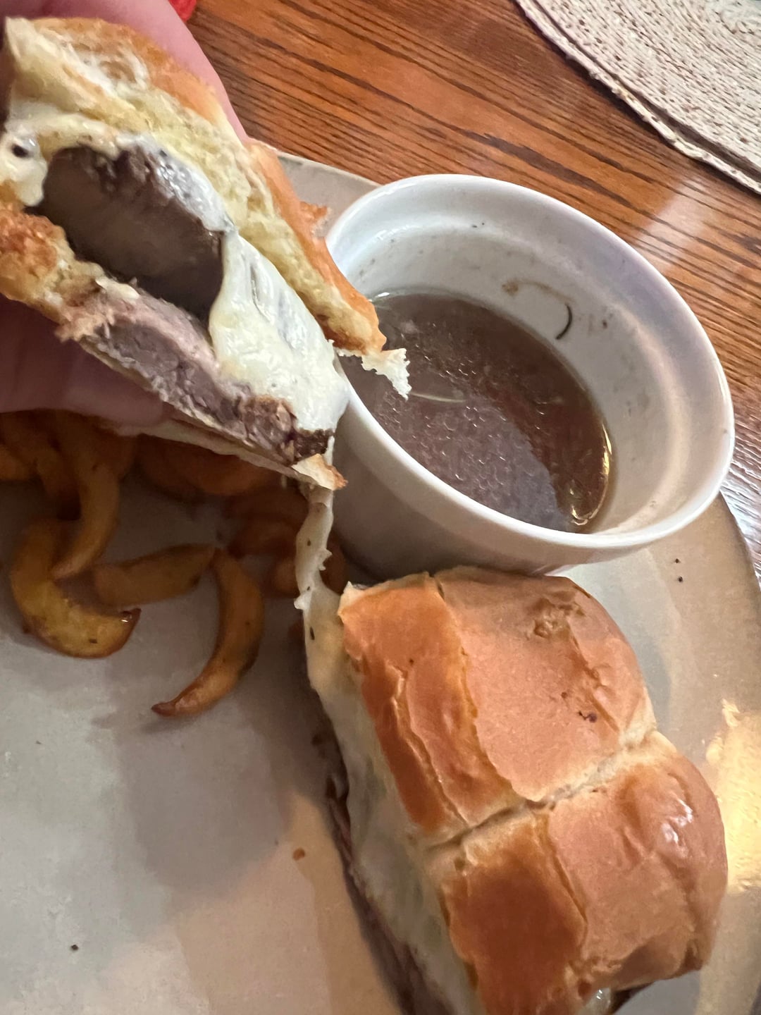 I know it doesn’t look like much but was on point. Half a New York strip, two slices of provolone with an au jus that cooked with 2 hours with roasted beef bones, herbs, and roasted garlic.
