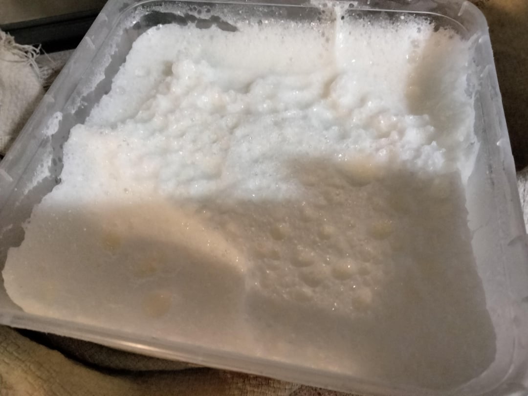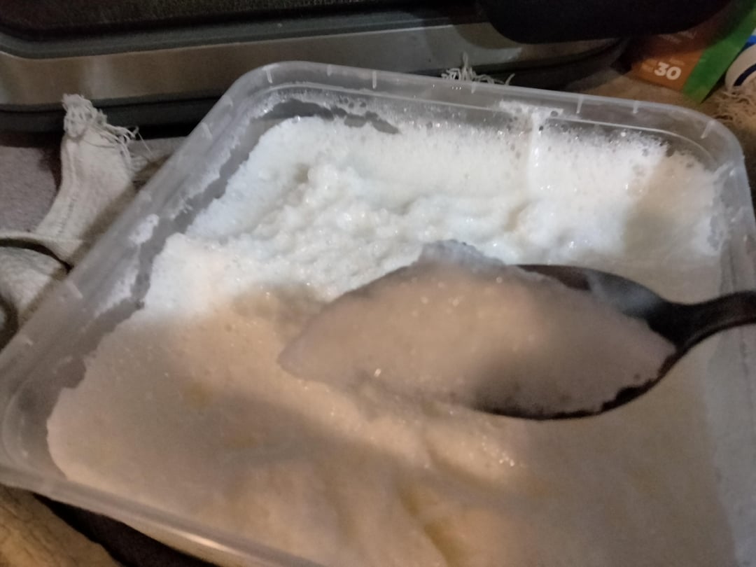 Then boil 2g agar in 2 cups water until well dissolved, and thoroughly incorporate with the yogurt mix. As it cools, whip with a mixer to incorporate air. You have to get the timing and temperature right for the air to stay incorporated but to not just break up already set agar. It should be warm but not scalding hot, and flow as a viscous liquid if you tilt the bowl. Pour into a container and let set in the fridge until cold.