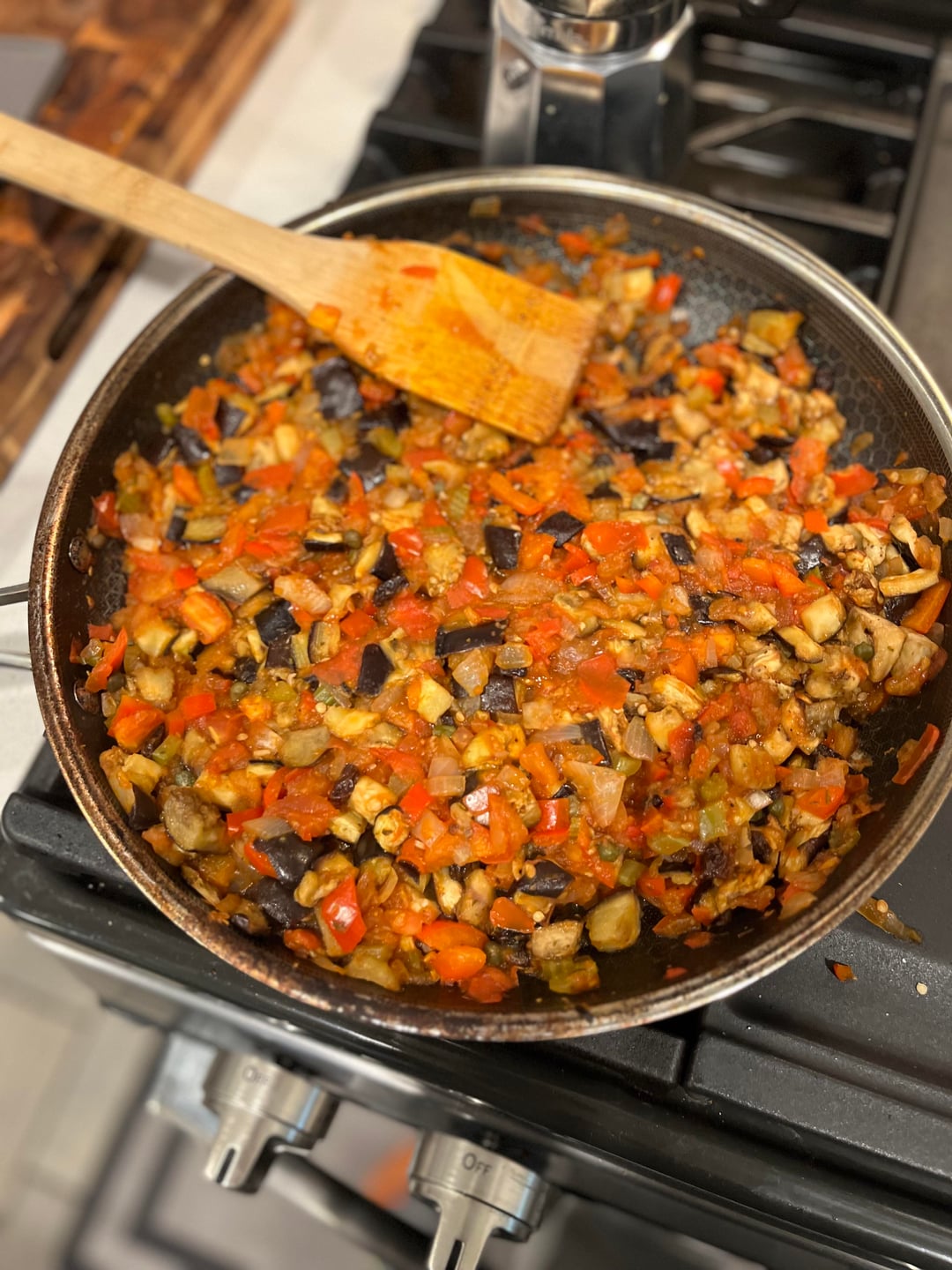 Method: roast eggplant. Sautee onion and celery. Add everything else and cook until soft. Finish with raisins/capers.
