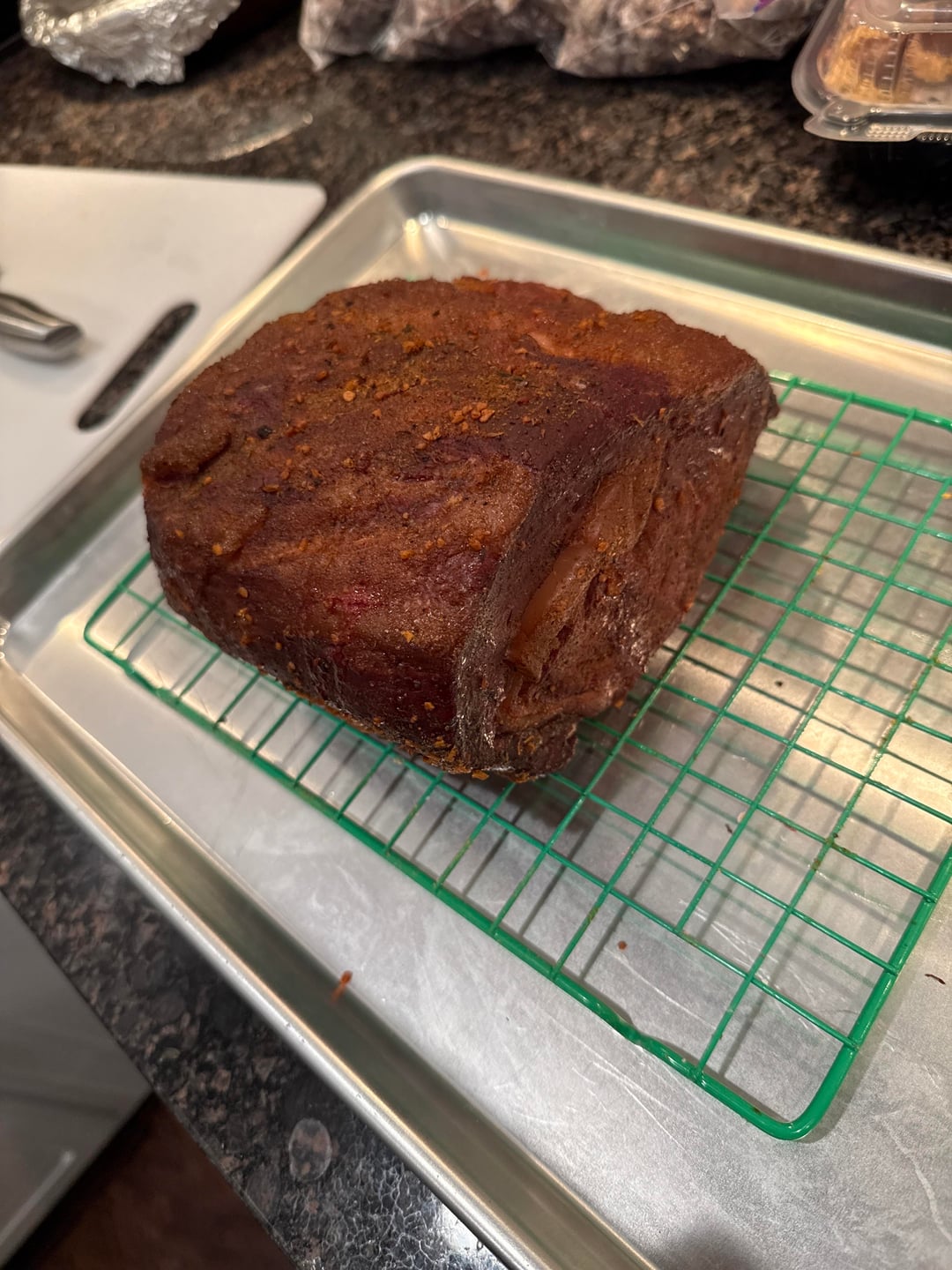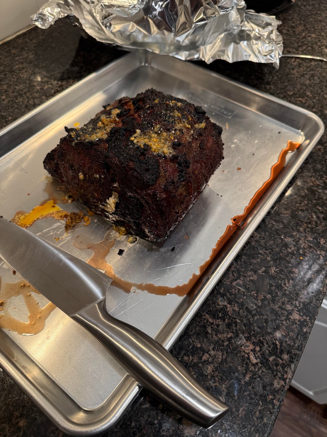 Dry brined in the fridge overnight then smoked with hickory at 250 until 120 internal. Rested then did a direct sear. I used kinders cowboy butter seasoning which was a bit salty but was happy the cook itself.