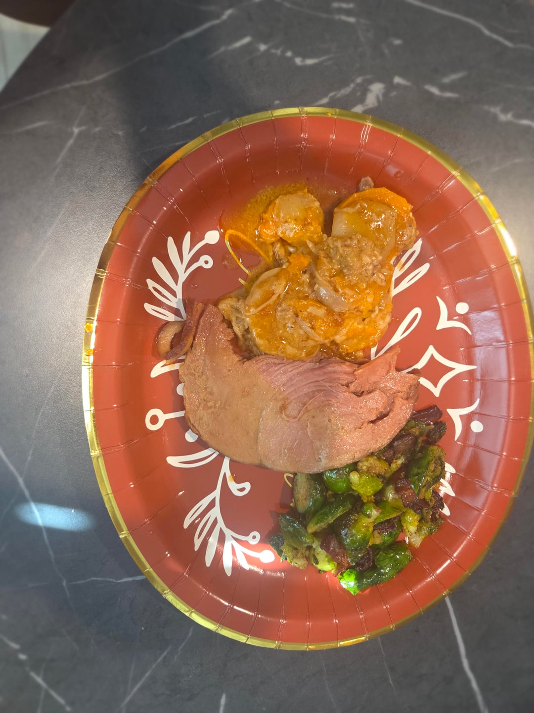 It's just me this year for Christmas, but I didn't want it to feel like an ordinary day. My local Walmart had hams for 4.00 each, I grabbed one russet potato and one sweet potato, which were 0.70 each and my luxury item, a bag of brussel sprouts for 3.00. I used pantry and fridge items like bacon, eggs, milk, flour and spices to make my mini feast. The majority of the ham was frozen and will be used, I'm anticipating bean soup with the ham bone, ham and cheese omelets, and ham salad sandwiches. What did y'all cook ?