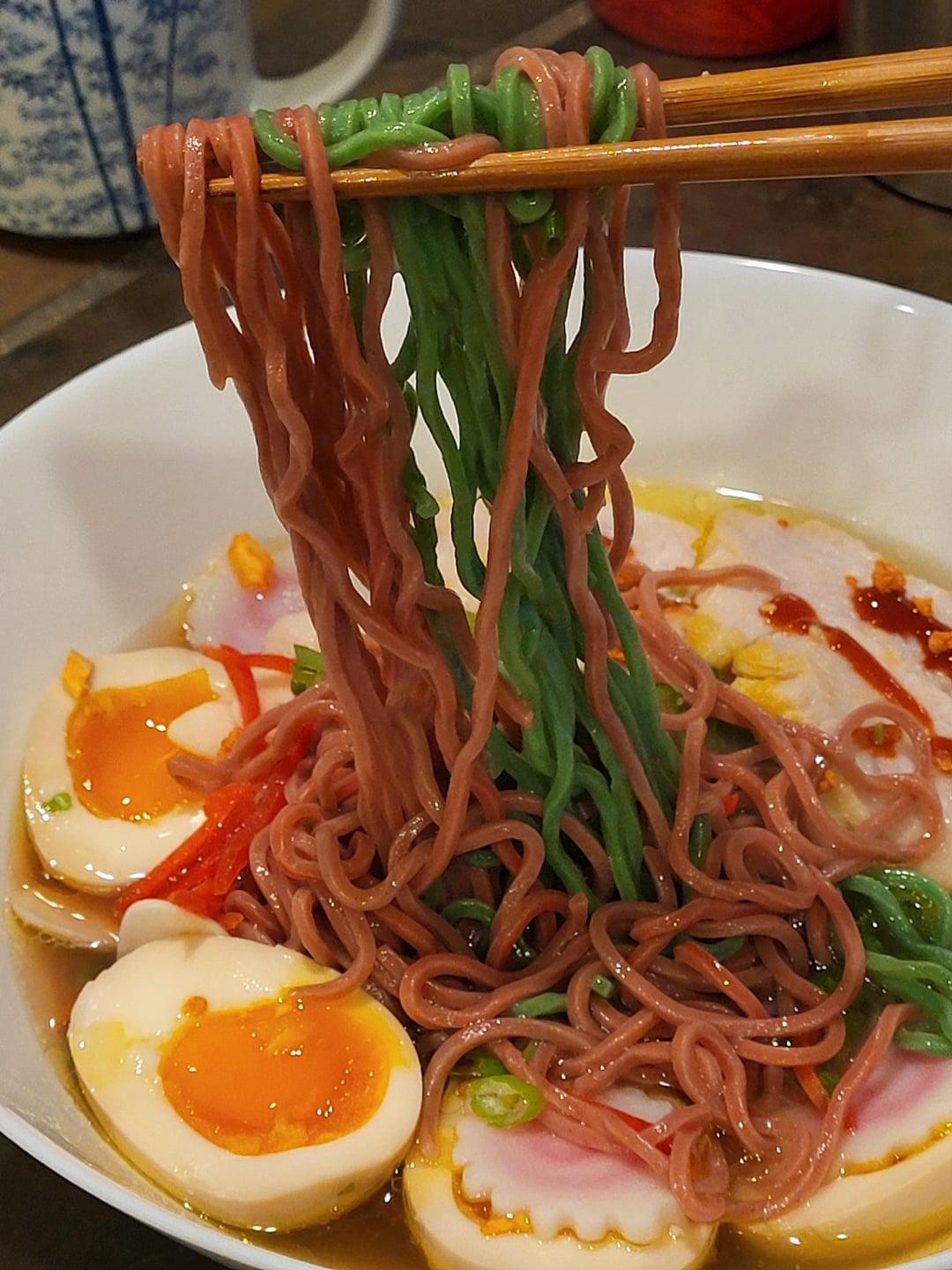 Noodle base recipe is Sapporo-style from Ramen Lord, to 37% hydration. Green is colored with chlorella powder and red is colored with the fermented red rice tofu (also for char shiu color iirc), plus a 4 drops each Wilson food gel dye to a 400g flour recipe. I used the white bread flour from Camas Country Mill.