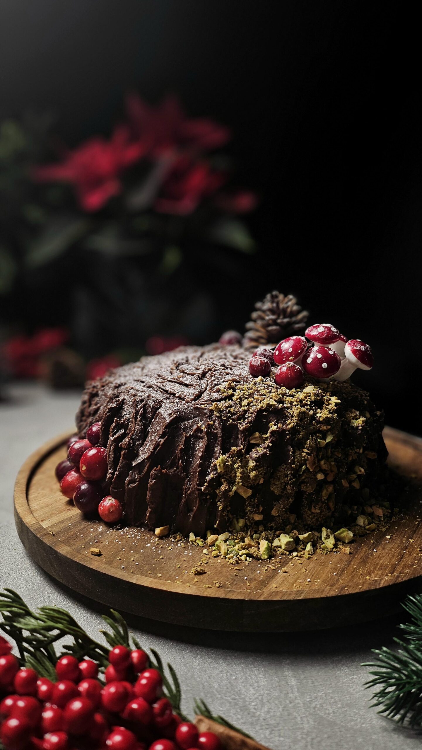 Press pistachios into grooves for “moss.” Add berries, rosemary, and a heavy dusting of icing sugar “snow.”