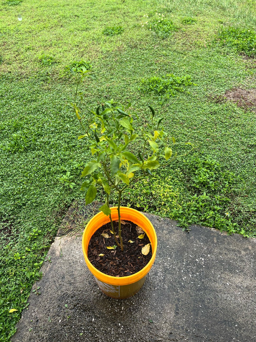 Looks like some sorta Thai pepper. Most likely red when it’s ripe, probably pretty hot. Make sure you have enough drainage in that bucket, leaves are looking a little yellow.