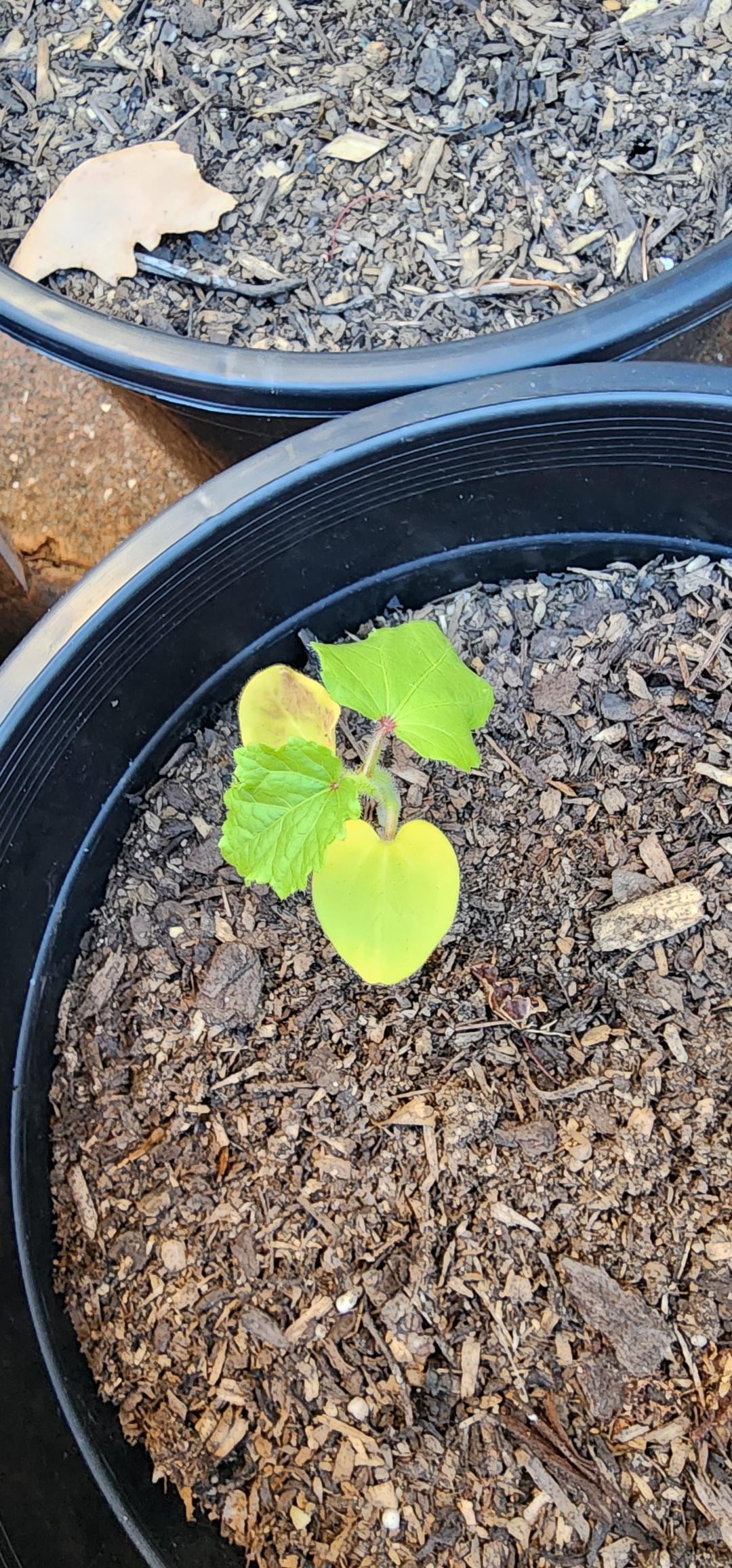 The yellowing looks like a nutrient deficiency. Nutrients in pots tend to wash out much quicker and need replaced.