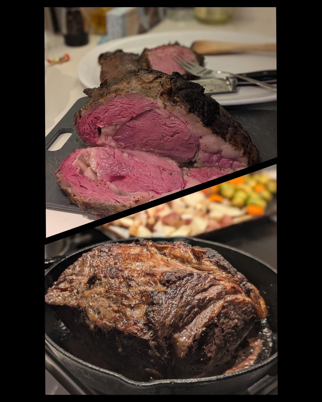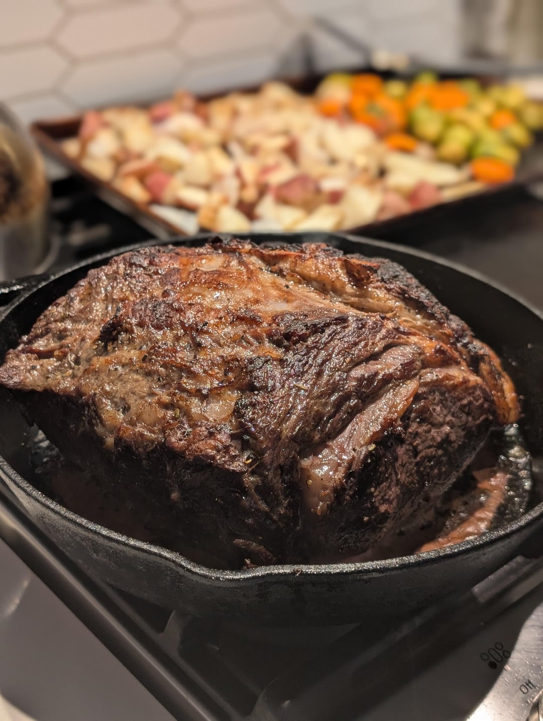 133 for 6-8 hours, piping hot cast iron dry sear. Rest a bit, bathe in butter and hit it with one last broil in the 550 degree oven switched to broil + high for 5 minutes.