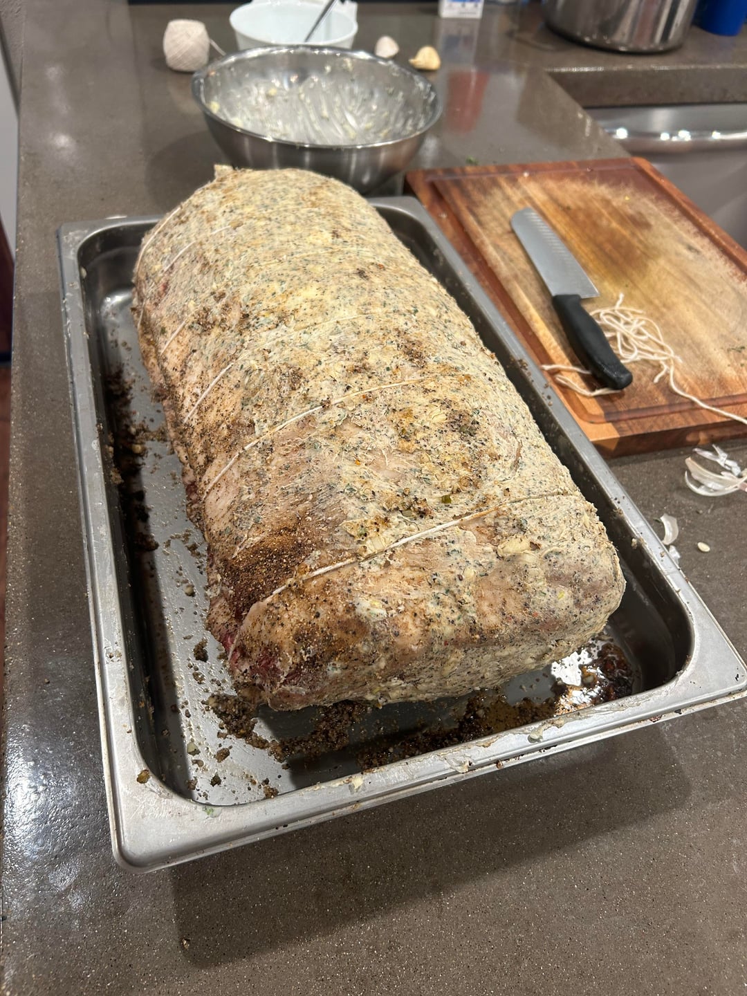 Thankful for the Christmas sale on these rib roasts to be able to cook these up for Christmas. 22 lb bone in choice ribeye @ $8/lb. Seasoned and tossed in the fridge 2 days prior. Tied it up. Mixed up a garlic/herb butter and smeared that over/under. Smoked for 4 hrs at 300~350F, adding charcoal/oak ever 45 minutes, pulled at an internal temp of 125F. Let it sit wrapped for 50 minutes and it crept up to 135F. Very happy.