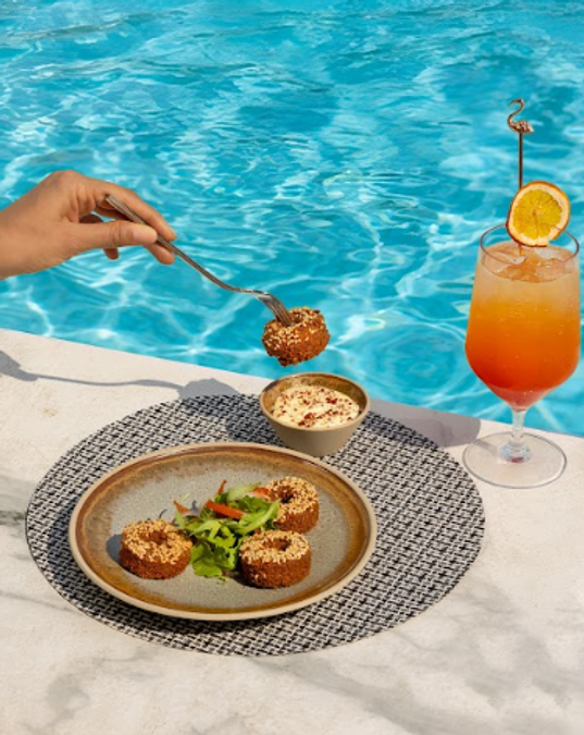 Samaa’s culinary offering showcases fresh, vibrant Mediterranean flavours prepared with thoughtful craftsmanship. During evening the guests can enjoy light, al fresco plates—think creamy Hummus, crisp Fattoush, Smoked Moutabal, Beetroot Knafeh with goat cheese mousse, handmade breads, and coastal-inspired favourites like Popcorn Shrimp and Spiced Squid. As night settles in, the menu shifts to soulful specialties including signature Turkish kebabs and grills such as Kebab Istanbuli, Pirzola lamb chops, Sheesh Taouk. The experience concludes beautifully with desserts like the Hazelnut Baklava Ice Cream or the Rose Umm Al; perfect for both relaxed, and starlit dinners.