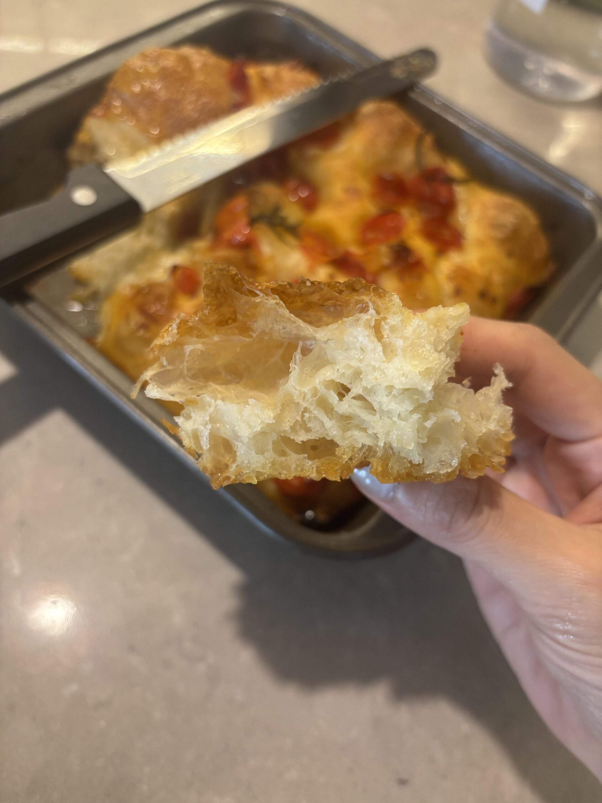 And I really think the trick is to use much lesser instant yeast and to use room temp water, not warm (might even work to use cold water). I made these tweaks and cold proofed the dough overnight for ~14hrs after bulk fermentation and the result was a really flavourful and fluffy focaccia.