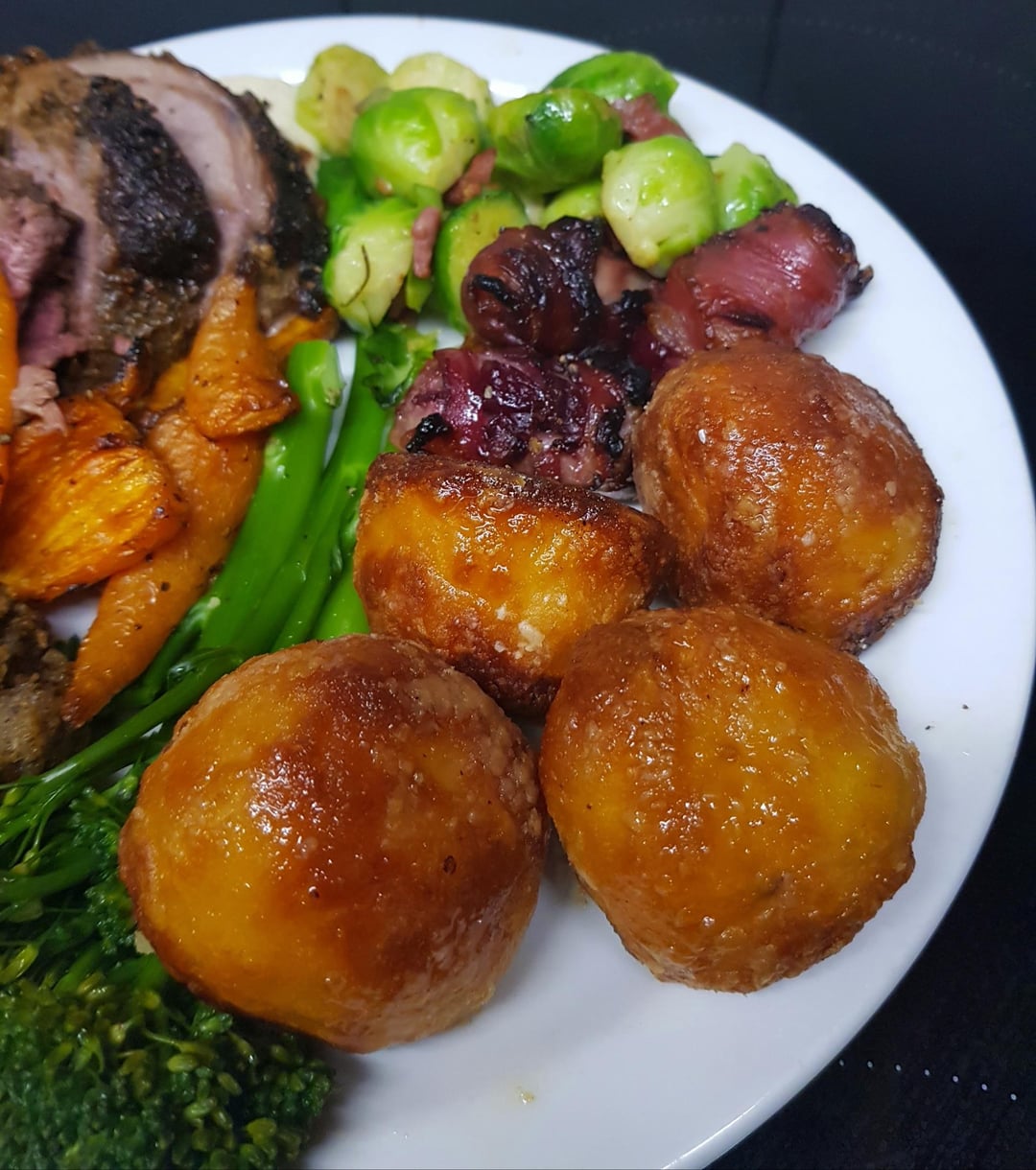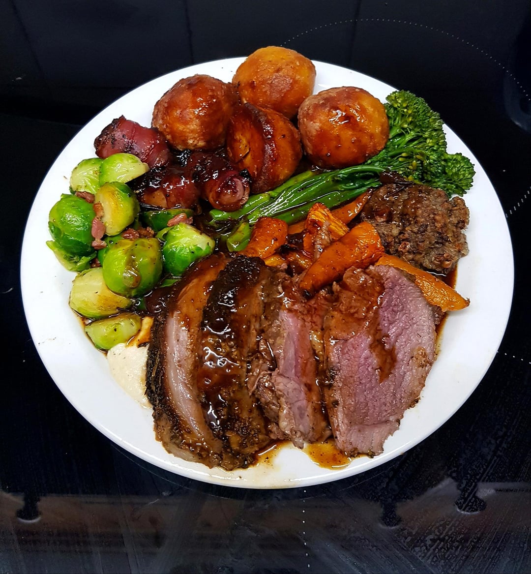 pink_flamingo2003 3 months ago This is what is here – • Roast Leg of Lamb – brushed in mustard, oil and garlic and covered in herbs and spices• Goose Fat Potatoes• Pigs in Blankets – sausage stuffed with cranberries and wrapped in smoked bacon• Sausage Meat Stuffing – with oats, breadcrumbs, onions and a bzillion herbs• Brussels with Bacon – blanched brussels, crispy bacon, sautéed in garlic butter• Cauliflower Puree – with a little horseradish• Glazed Carrots – brown sugar and butter basted• Sautéed Brocolli• Red Wine Pan/ Meat Juice Gravy
