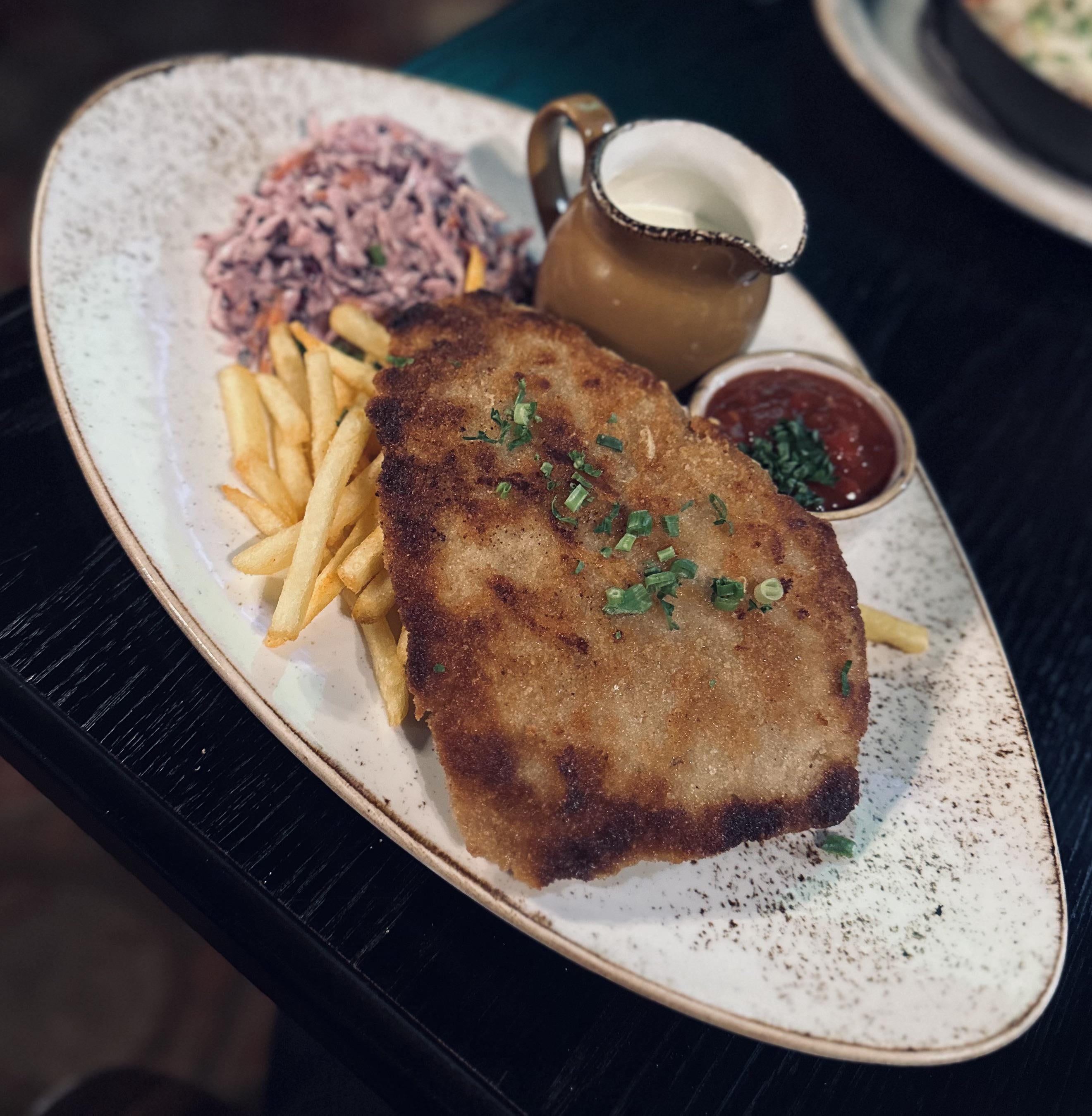 Breaded meat (I can’t use right word here because of rules) with fries and coleslaw salad