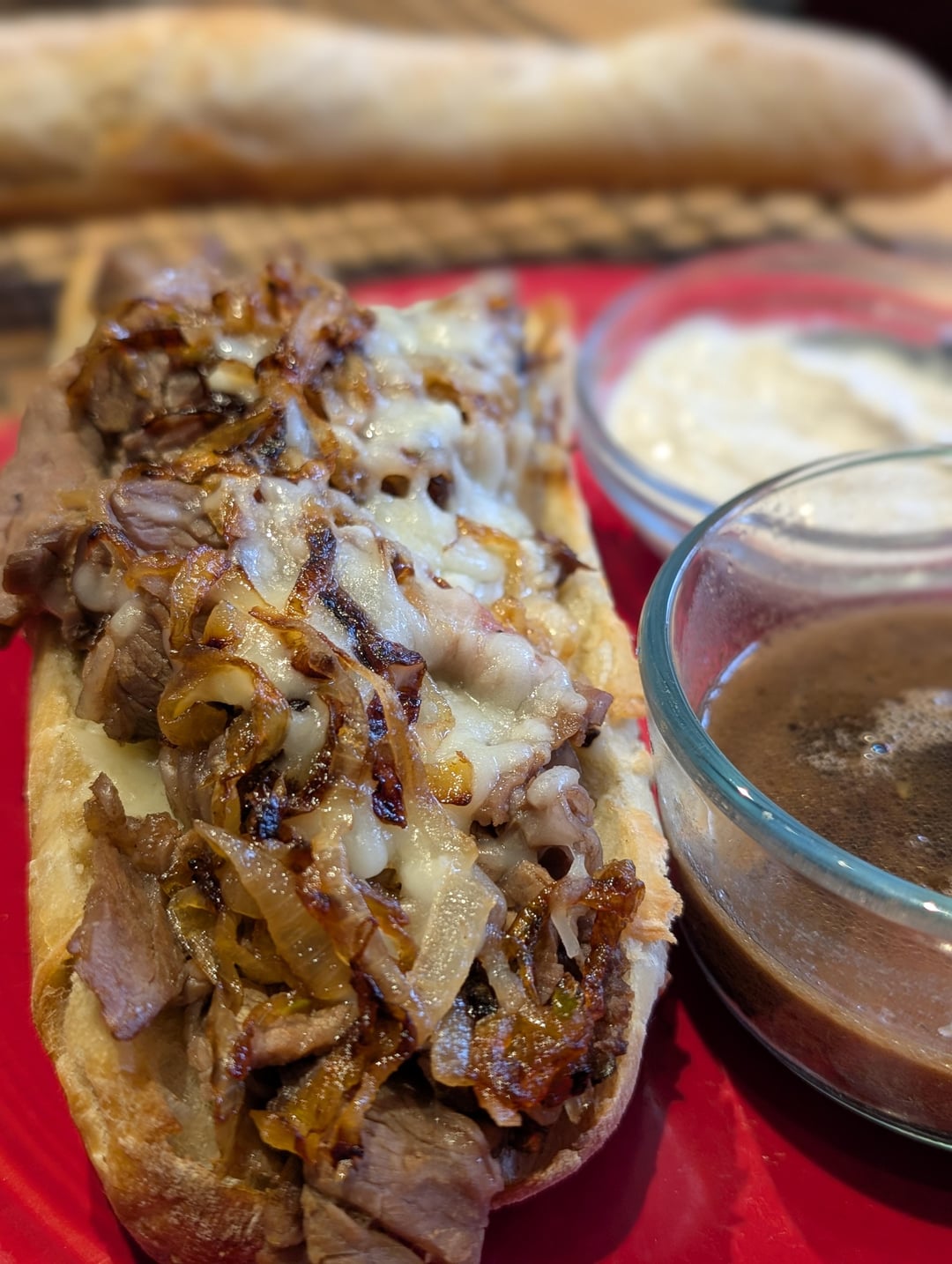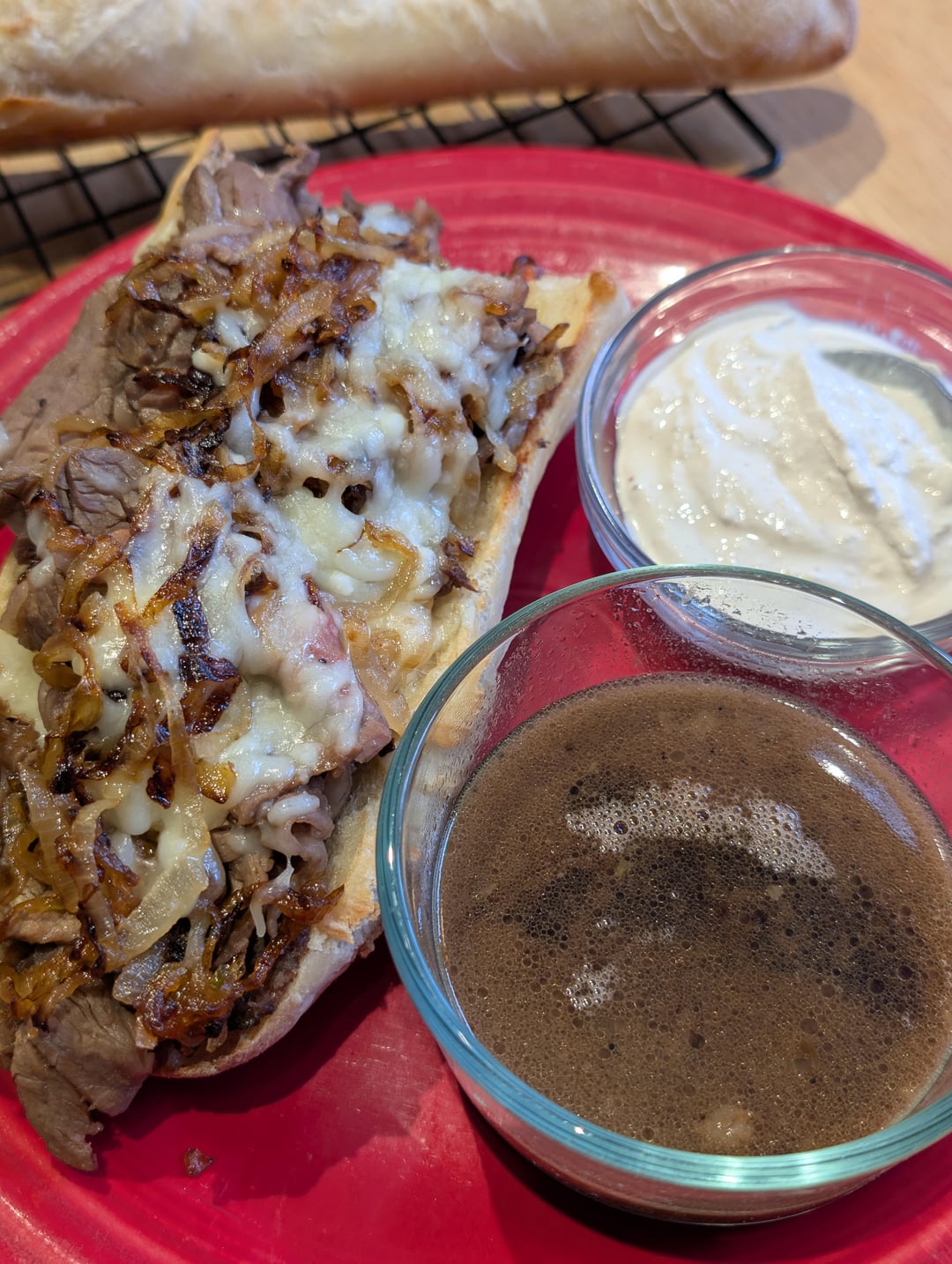 I had a very similar meal last night but with homemade French onion soup as the au jus, and a horseradish mayo sauce on the sourdough.
