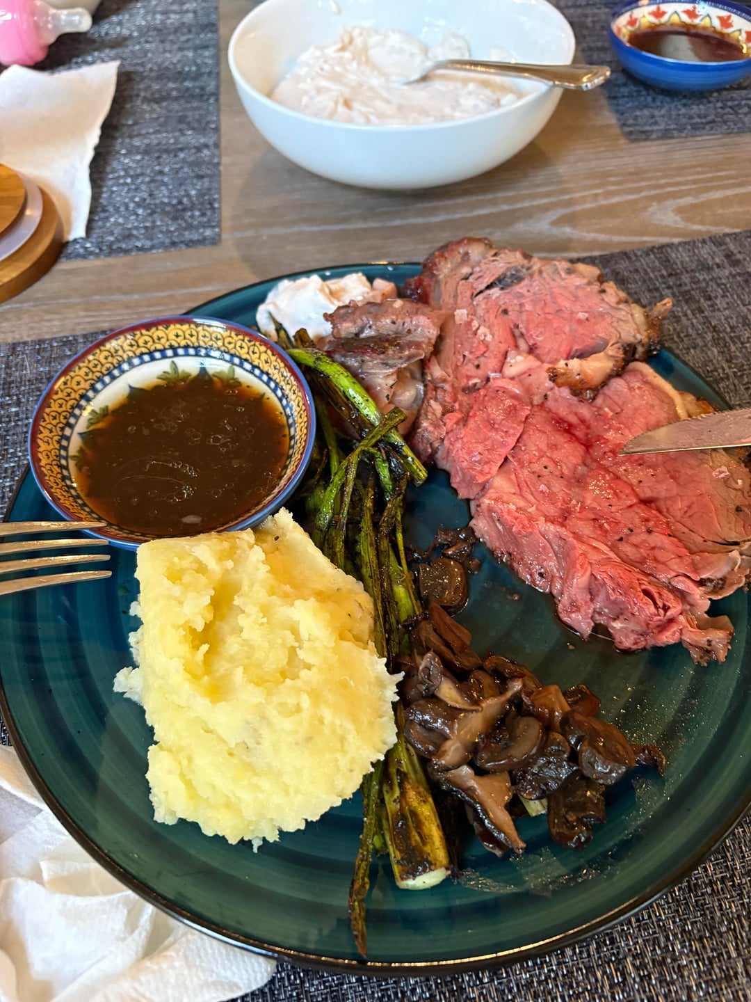 Served with sautéed mushrooms, mashed potatoes, au jus, creamy horseradish, and grilled asparagus. The bark honestly tasted like bacon, it was amazing. Fat was rendered.