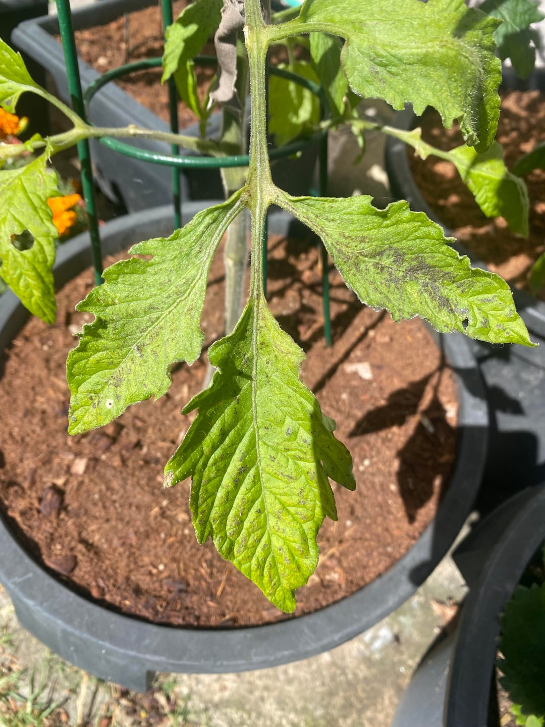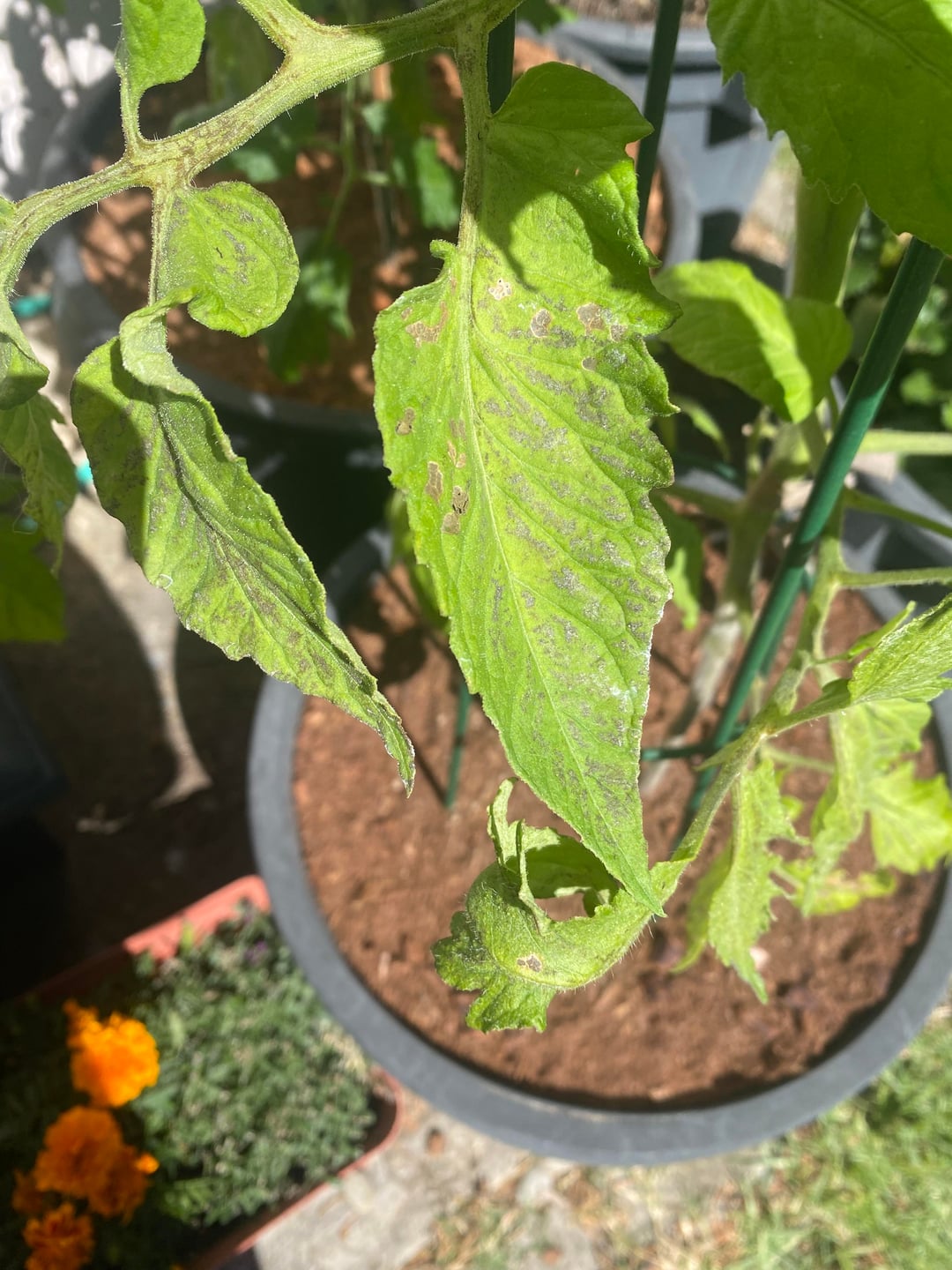 Disregarding the holes in the leaves from insects, my leaves have developed these strange greyish brown patches of stripes on the lower leaves. They’re shiny in the sun and seem to be turning white at the edges. I recently sprayed them with an eco insecticide oil, but I’m not sure that’d be related. This has developed over 3 days. Any help is much appreciated.