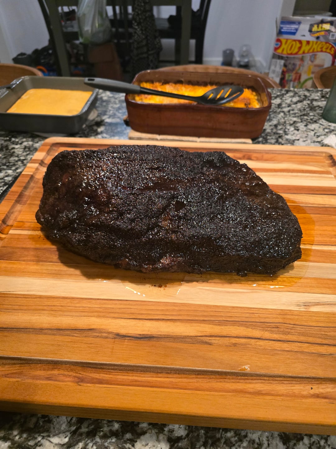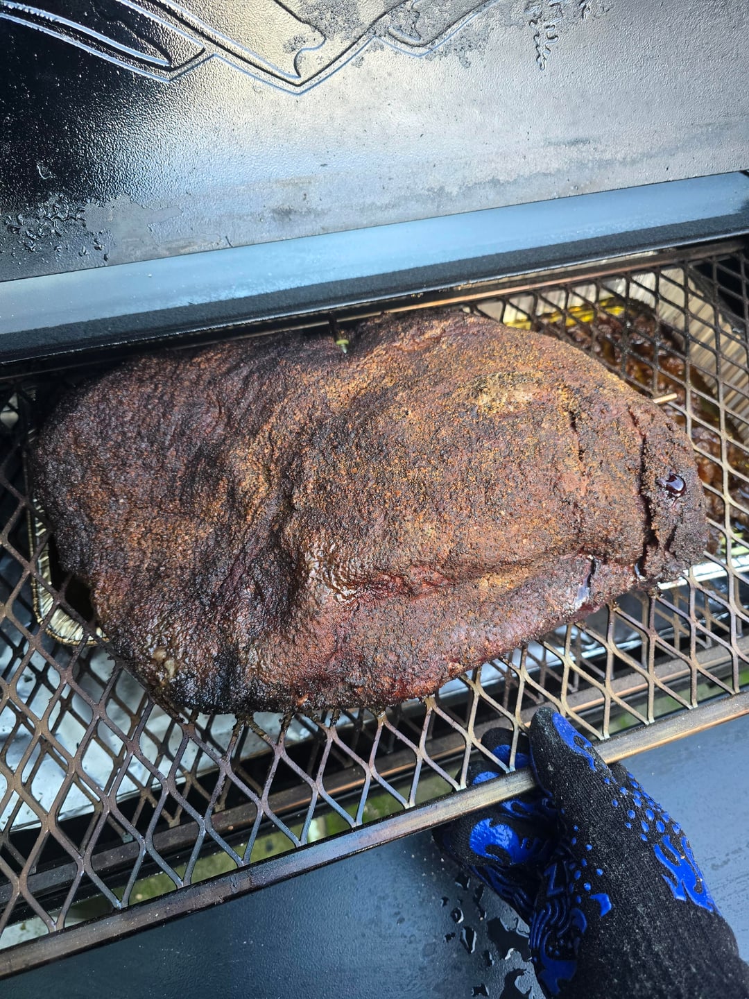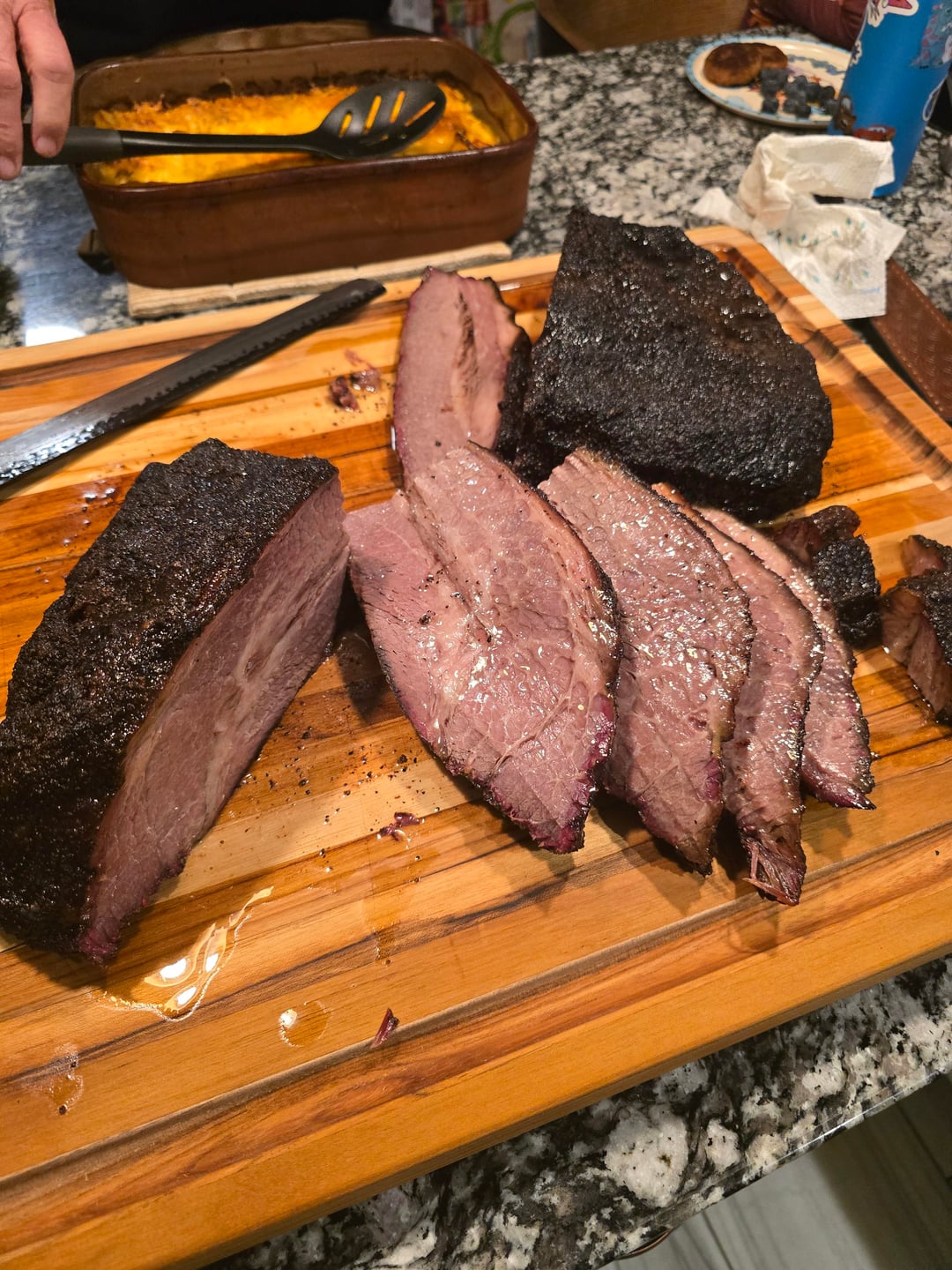 Old Texas Elite with Savannah Stoker and pimp my grill racks. Goldees brisket rub. Top rack at 200* overnight starting at 7pm fat side up. 12" & 6" smoke tubes and water pan below. 225* @ 8am, 250* 10am & 300* @11am with foil boat. Pulled at 1:30pm when 205 in flat and 201 in point probe tender. 1 hour rest on counter before wrapping in foil with approx 1 cup tallow. Put boiling water in cooler for 20 mins before wrapping in towels to rest another 2.5 hours. This thing was juicy and exceeded all expectations! My dad grew up in Texas and loved it.