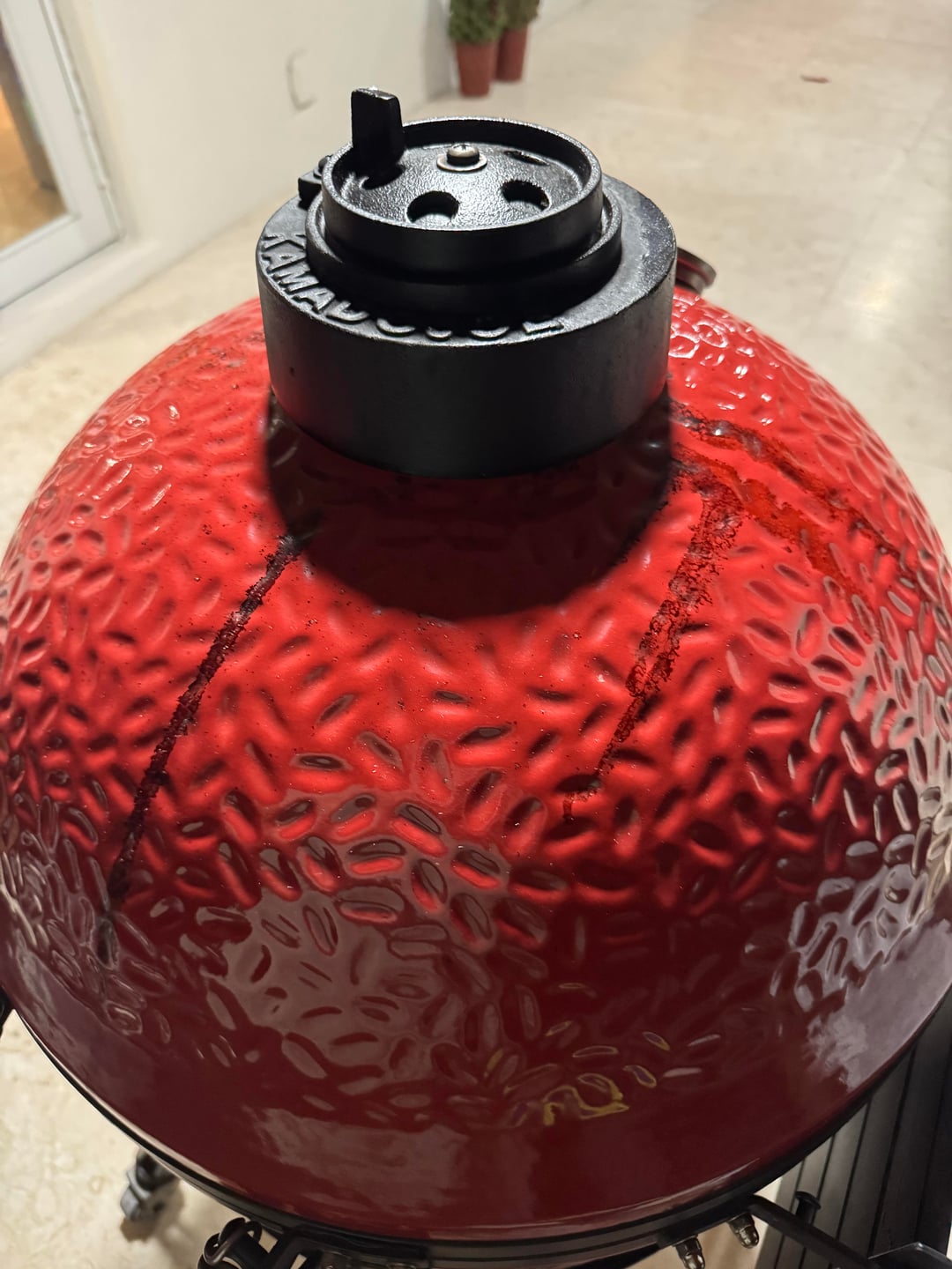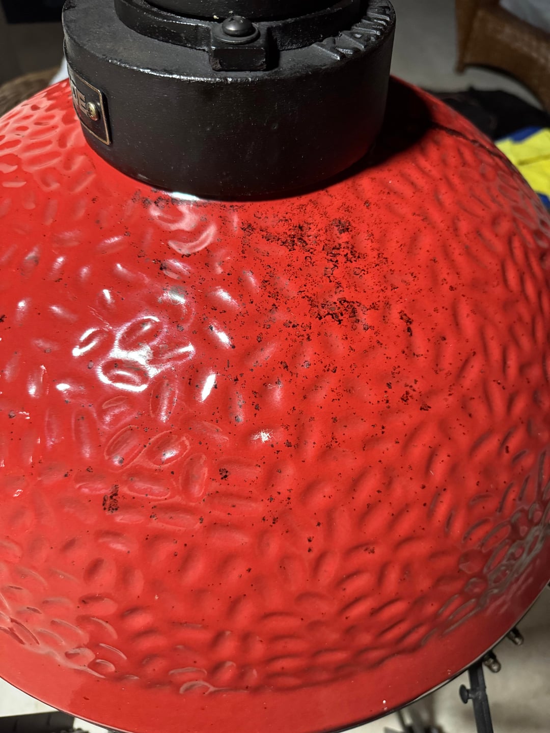 My Joe is about 6 years old and the exhaust vent started rusting around 2 years ago. It was starting to get worse and I wanted to prevent further damage so I chose to season it like a cast iron pan. I added a bit of oil to it while i started a cleaning cycle. It actually worked very well but on my third coat I guess I added a bit too much oil and while I was away it must have dripped down the egg staining the paint red. I tried cleaning it with an all purpose cleaner but it didn’t do anything. Am I just going to have to deal with the paint damaged or does anyone know how I can fix this?