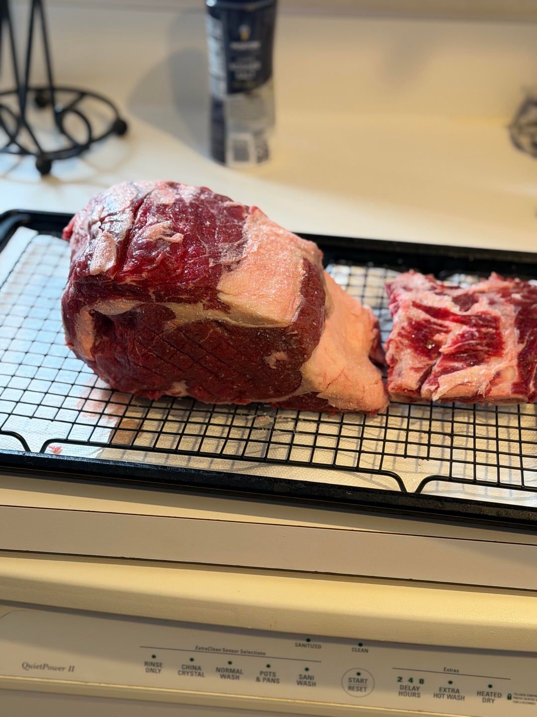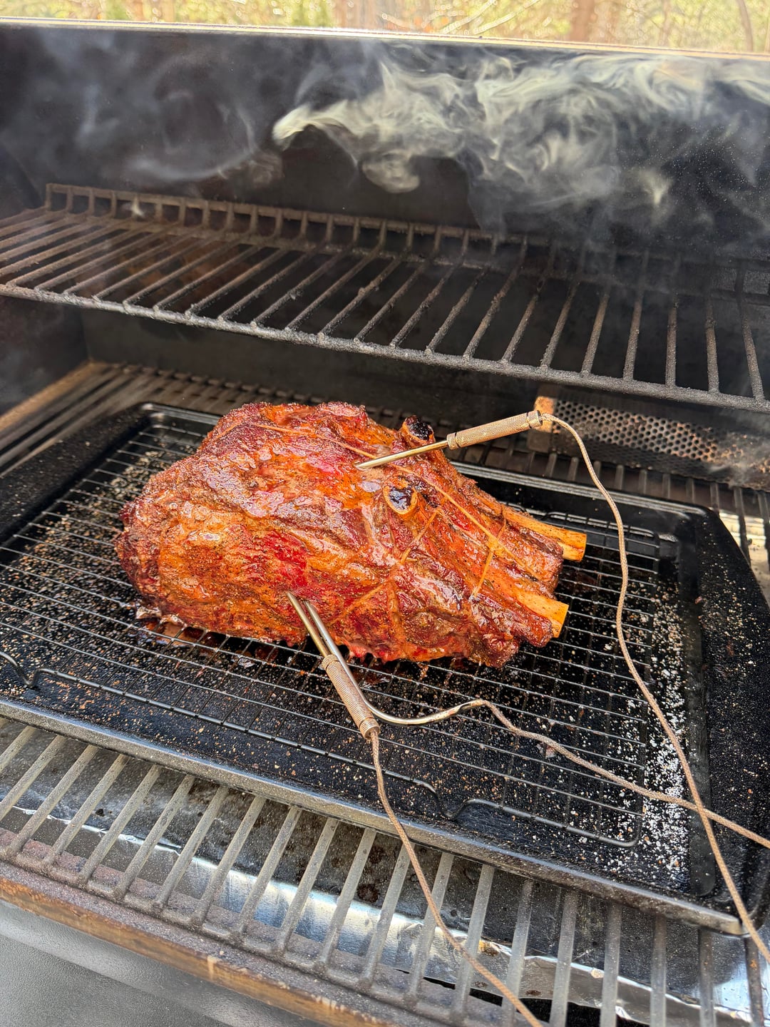 First time smoking a prime rib roast. Pretty clueless on the de-boning method but it worked out well. Might need a YouTube tutorial for that 🤣. Slathered it with a rosemary marinade and meat church holy cow dry rub then smoked at 275° and a smoke tube till it got to about 120° or so and then a quick sear at 475° to bring it up to 125°. Came out much better than expected. Didn’t take a pic of the middle slice for some reason but it was absolutely perfect!