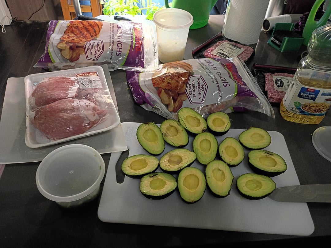 Sliced avocados, WEAR A CUT PROOF GLOVE WHEN CUTTING THESE. AVOCADOS SOMEHOW ARE THE MOST DANGEROUS TO CUT UP. I didn't cut myself because of my cut proof glove, so don't worry.