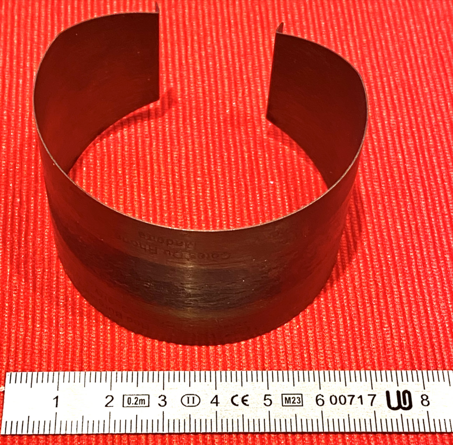 It’s a partial ring made out of spring steel. I know it’s steel because it’s magnetic. So, despite its bronze color, it’s steel. Probably stainless steel because it’s not rusted, and it had been there probably for decades. A bit of quick research suggests it’s 400 series stainless steel and probably has a martensitic structure, which is what makes it magnetic while having the properties of spring steel.