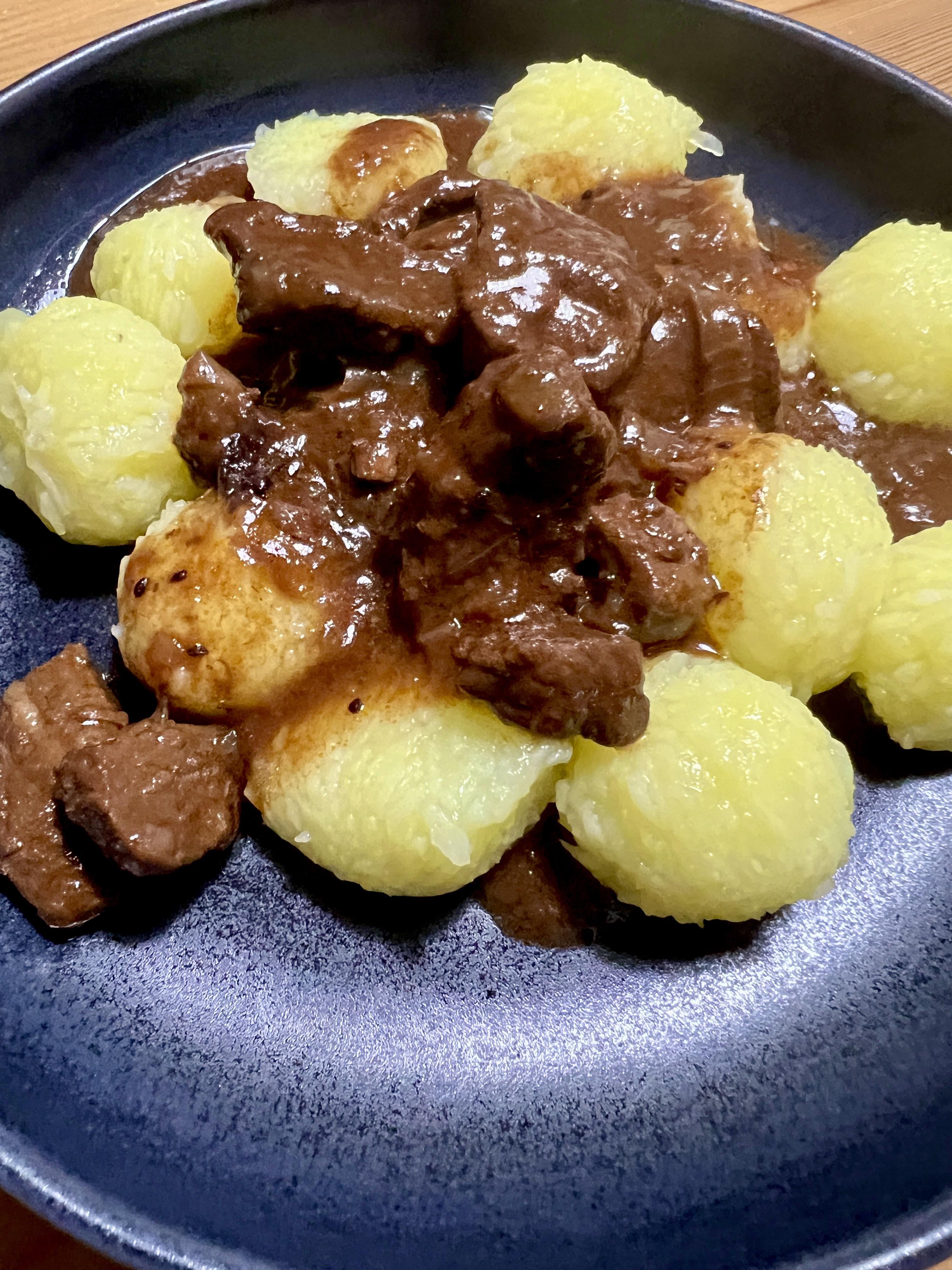 Beef cubes simmered in broth and red wine for about five hours. Served over store bought mini potato dumplings.by hansebart 1 Comment Subject_Slice_7797 4 days ago Oh, did you run out of duck? 😂Looks great, as always!