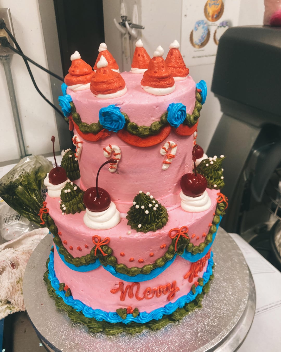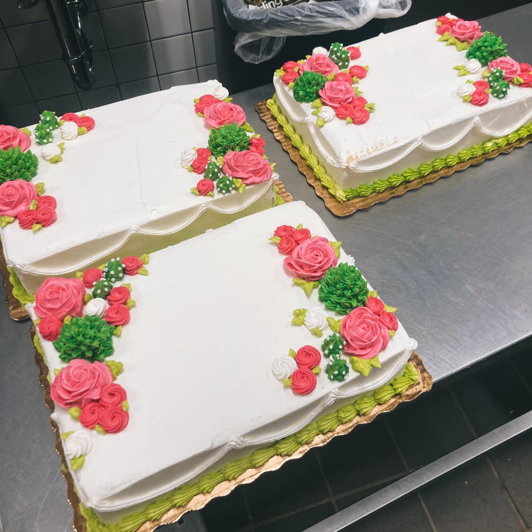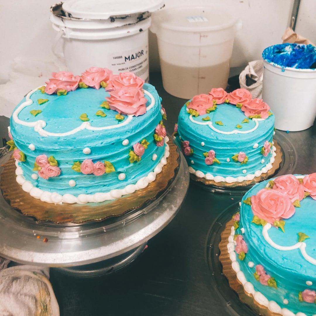 i work in the publix bakery & these are some cakes i've made this year while learning to decorate. i've recently been promoted to an official decorator & hope to grow more throughout the next year. the two-tier is the only tiered cake i've ever done so far, & it was very stressful as i had to do it quickly & had never done several of the piping details on it before. & i still struggle with icing sheet cakes, so that's something i want to gain more experience with.