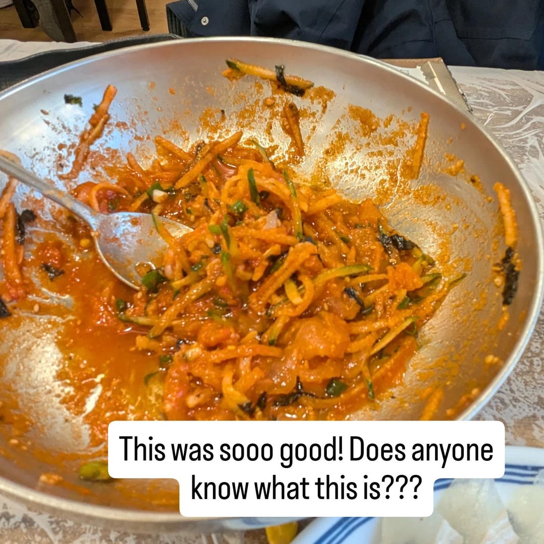 Recently visited Pohang, South Korea. My husband and I went to Jukdo Market and ate snow crab at one of the restaurants. Our meal came with all of these sides (plus steamed crab and fish stew!) We tried everything and were pleasantly surprised by how much we enjoyed it. My favorites were the cold vegetable dish and the soy marinated crab. Does anyone know the name of the vegetable dish (see blue arrow)? It was sweet, cold, crunchy, and so refreshing! Even though it's very red, it was not spicy at all. The ladies explained that they also included bits of sashimi with the shredded vegetables. She told me the name, but I don't remember it at all. If you have a good recipe for the veggie dish or the soy marinated crab, that would be awesome too! I would love to make this for myself at home.