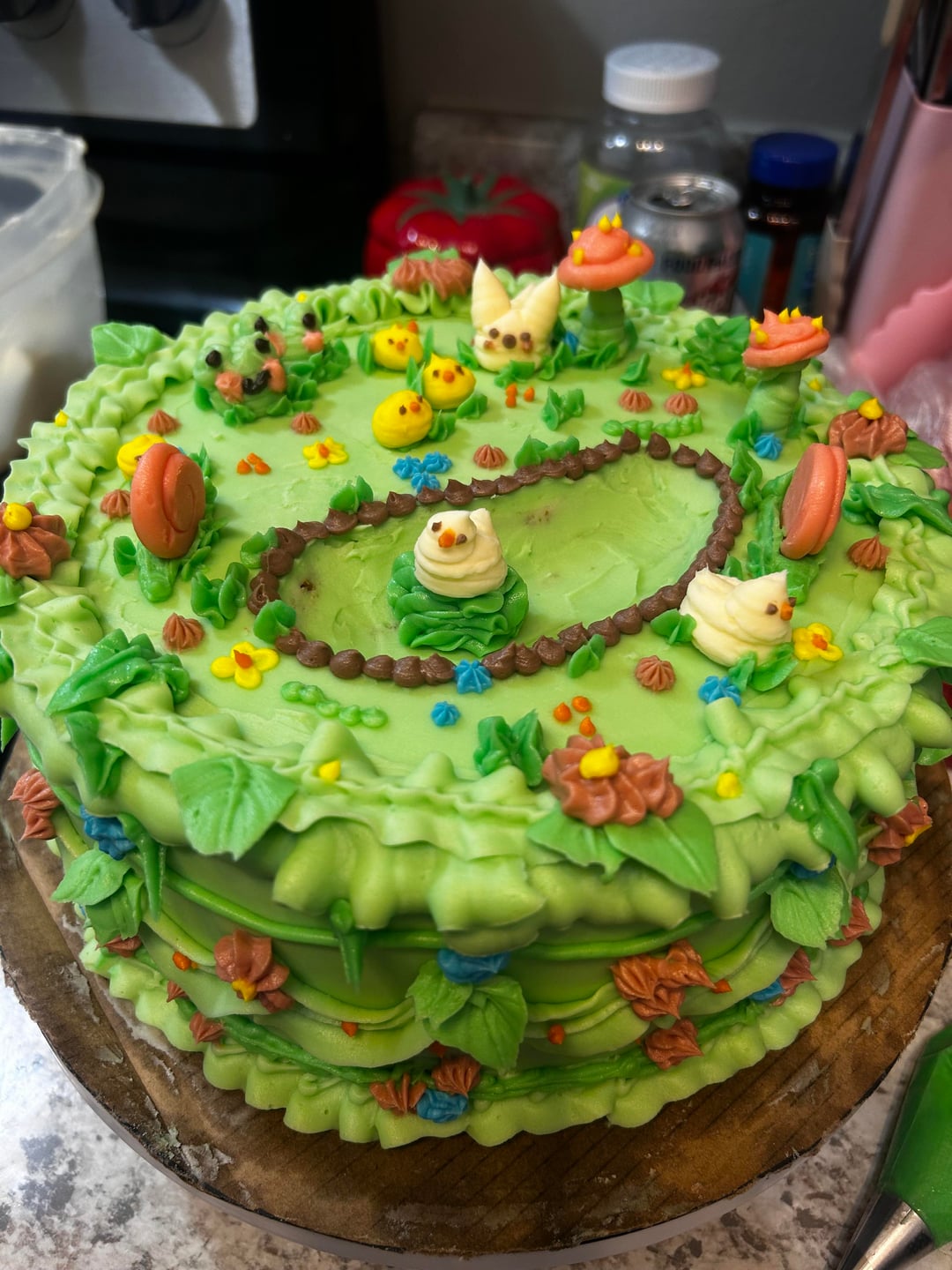 First time making a cake and buttercream from scratch πŸ™‚ i put a little pond made out of jello but forgot to get a pic before putting it in the box/freezer.