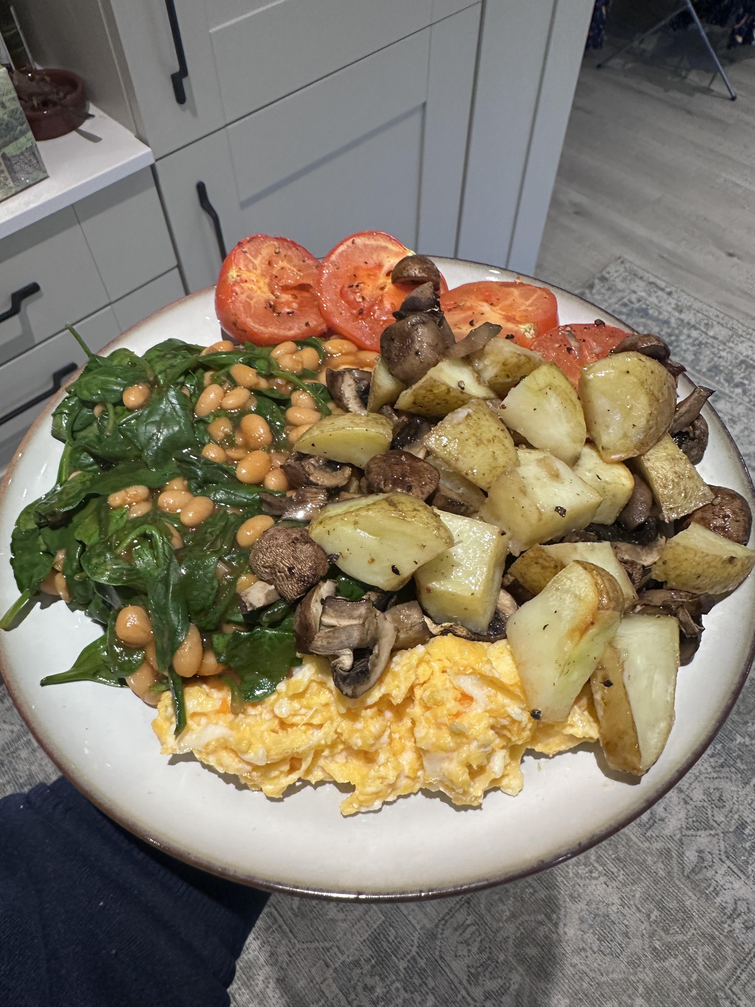 Oven roasted potatoes, tomatoes and mushrooms. 2 eggs, beans and a handful of spinach. Super filling. by Londoner1982 Dining and Cooking