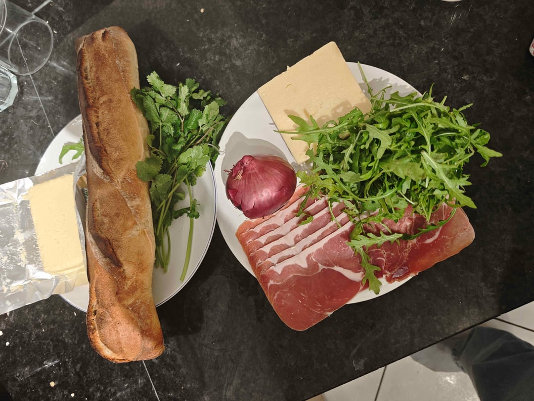 I feel like I would want this as two different simpler baguette sandwiches to let the bread and butter shine. One with butter, Serrano, and arugula very lightly dressed in olive oil, salt and pepper. The other one would be the butter, mature cheddar, and very thinly sliced red onion.