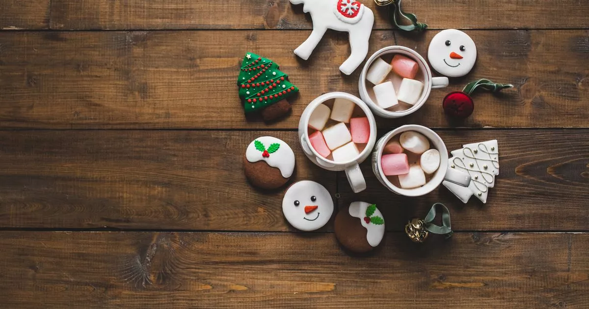 Tasty homemade gingerbread Christmas cookies with cacao with marshmallows on wooden background, top view. Deer, snowman, christmas tree shapes. Christmas cookie pattern. Winter holidays dessert ornament. Gingerbread biscuit collection creative arrangement with space for text.(Image: Getty Images)